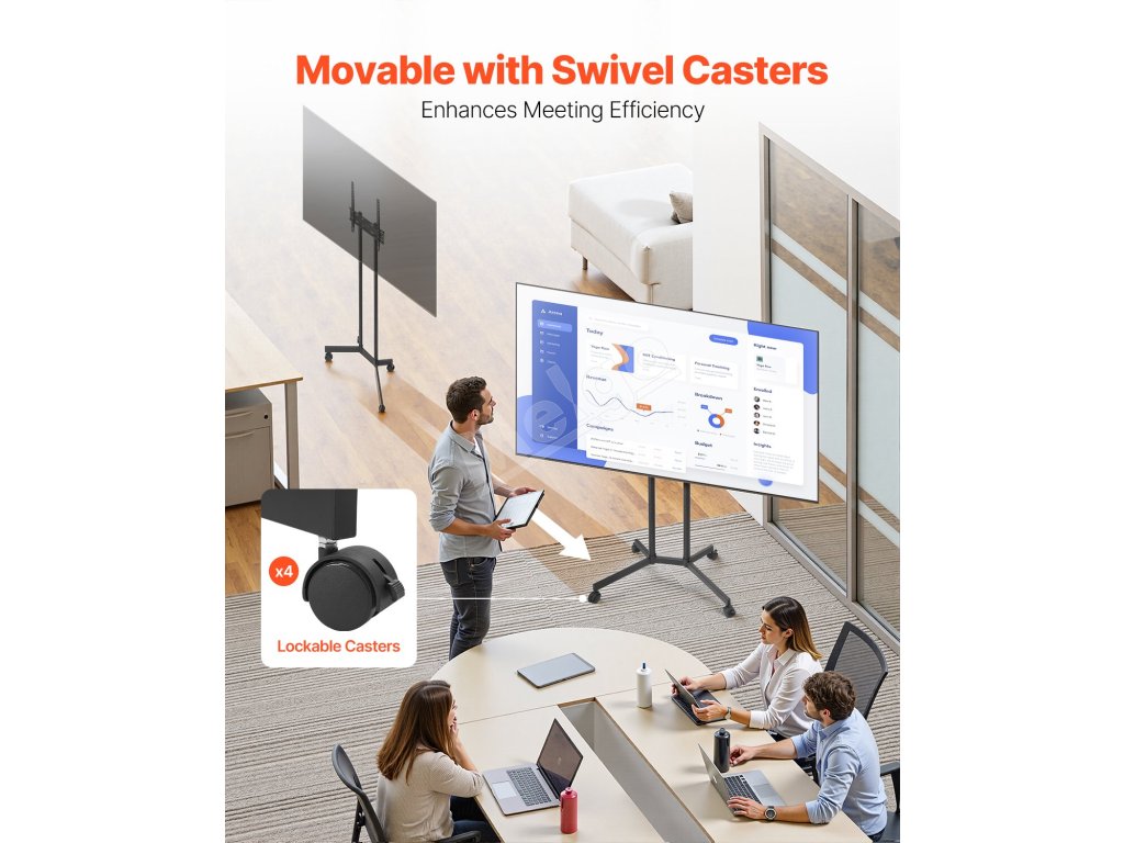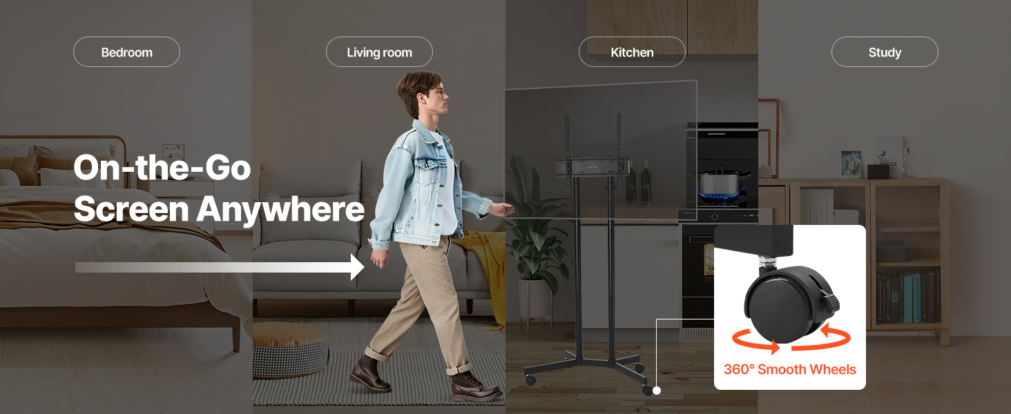 Náš mobilný držiak na televízor je vybavený otočnými kolieskami, ktoré umožňujú rýchle premiestňovanie televízora z jednej miestnosti do druhej.