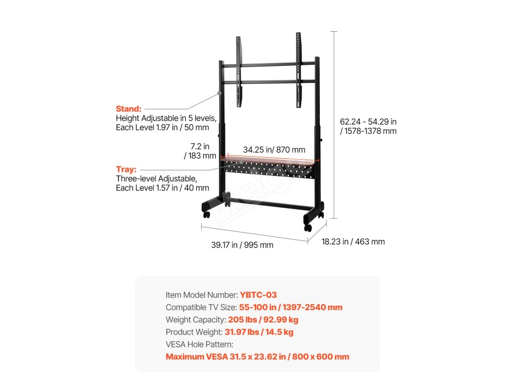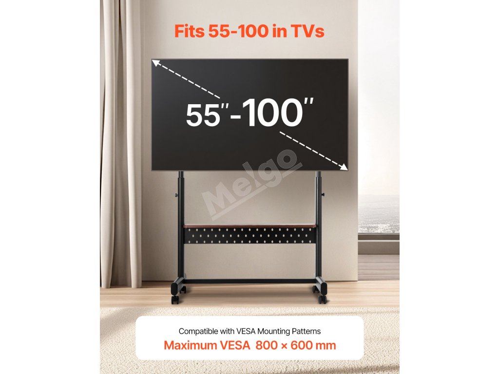 Mobilný stojan na tv 55–100 inch, nastaviteľný, 800 × 600 mm, 205 lbs