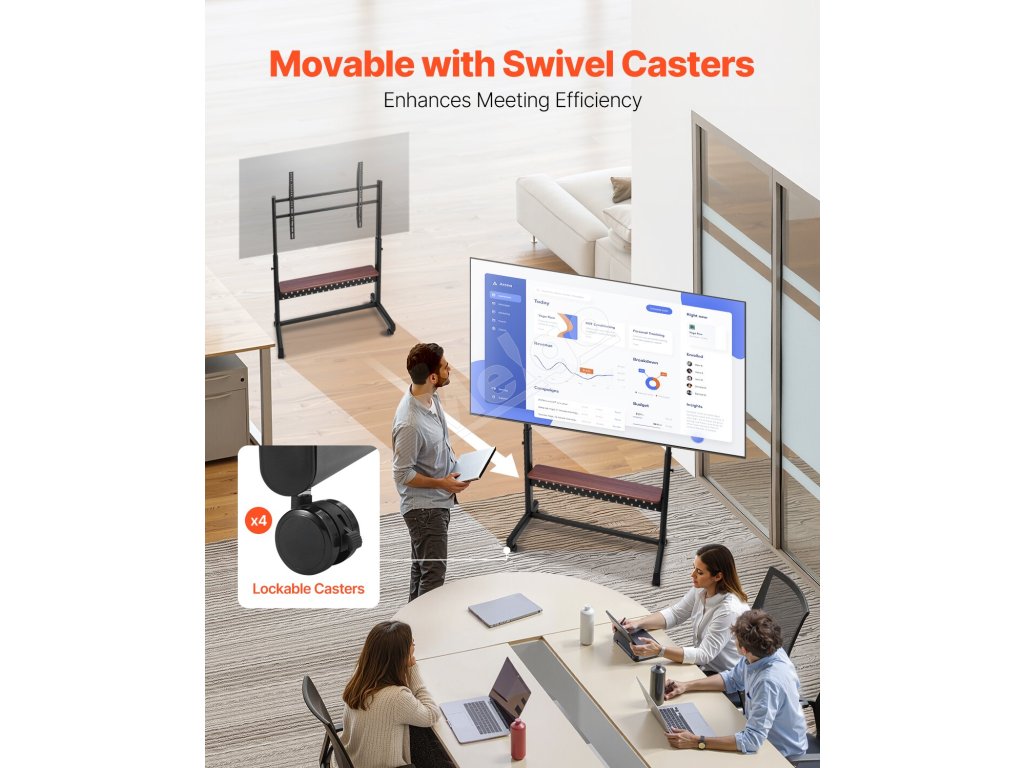 Náš mobilný držiak na televízor je vybavený otočnými kolieskami, ktoré umožňujú rýchle premiestňovanie televízora z jednej miestnosti do druhej.
