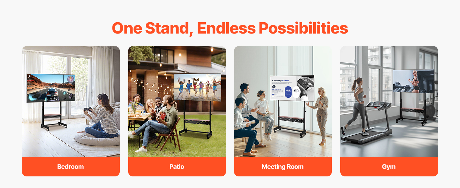 Vďaka rôznym možnostiam nastavenia sa tento pohyblivý stojan na TV prispôsobí rôznym preferenciám sledovania a zabezpečí, aby bol váš TV vždy v ideálnej výške na pohodlné sledovanie.