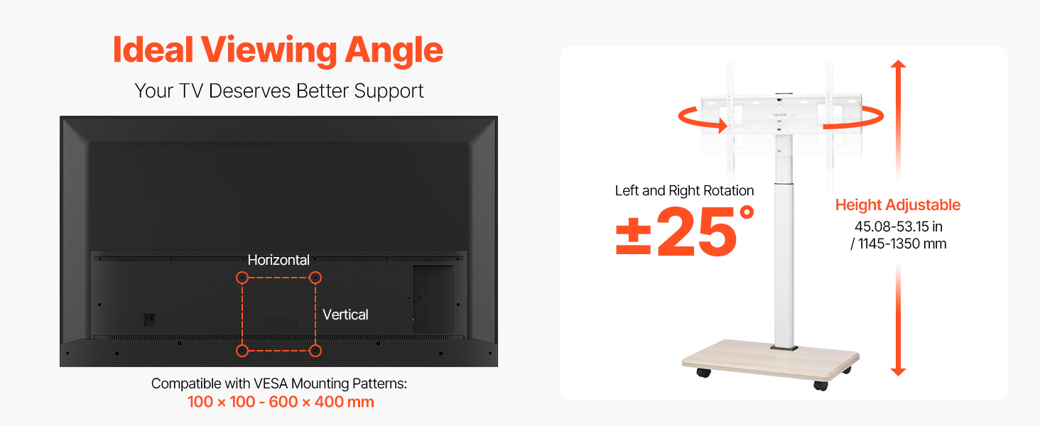 Vďaka rôznym možnostiam nastavenia sa tento pohyblivý stojan na TV prispôsobí rôznym preferenciám sledovania a zabezpečí, aby bol váš TV vždy v ideálnej výške na pohodlné sledovanie.