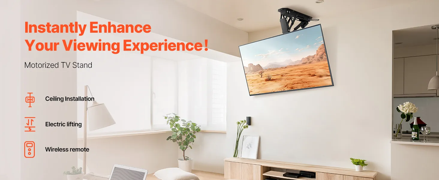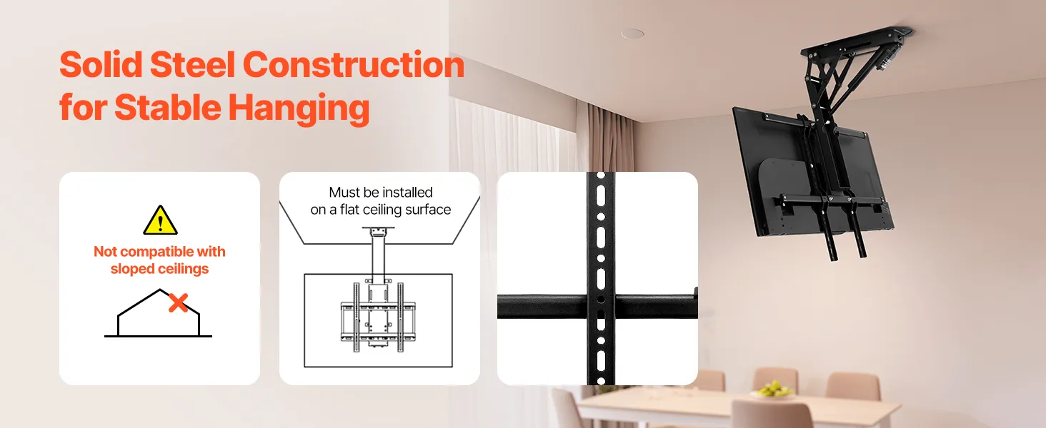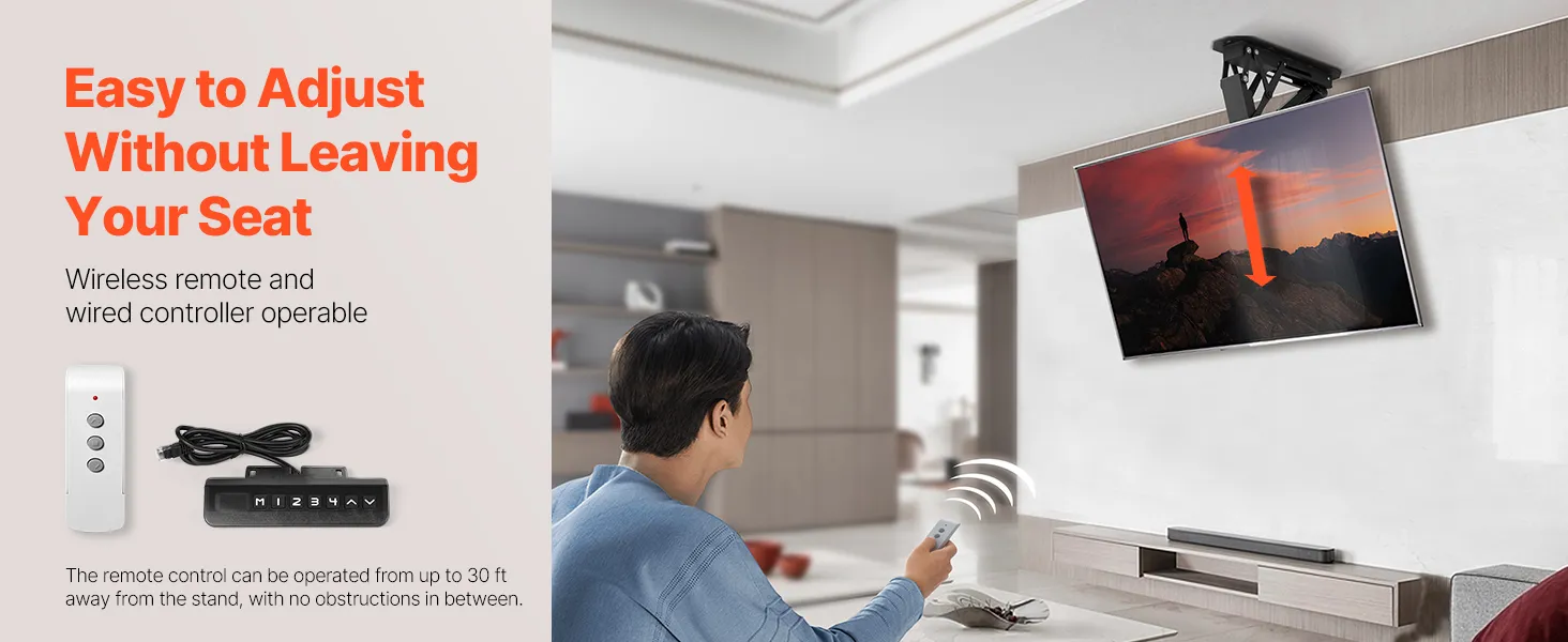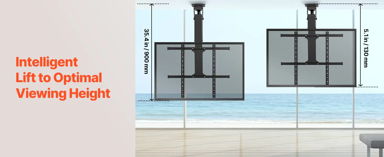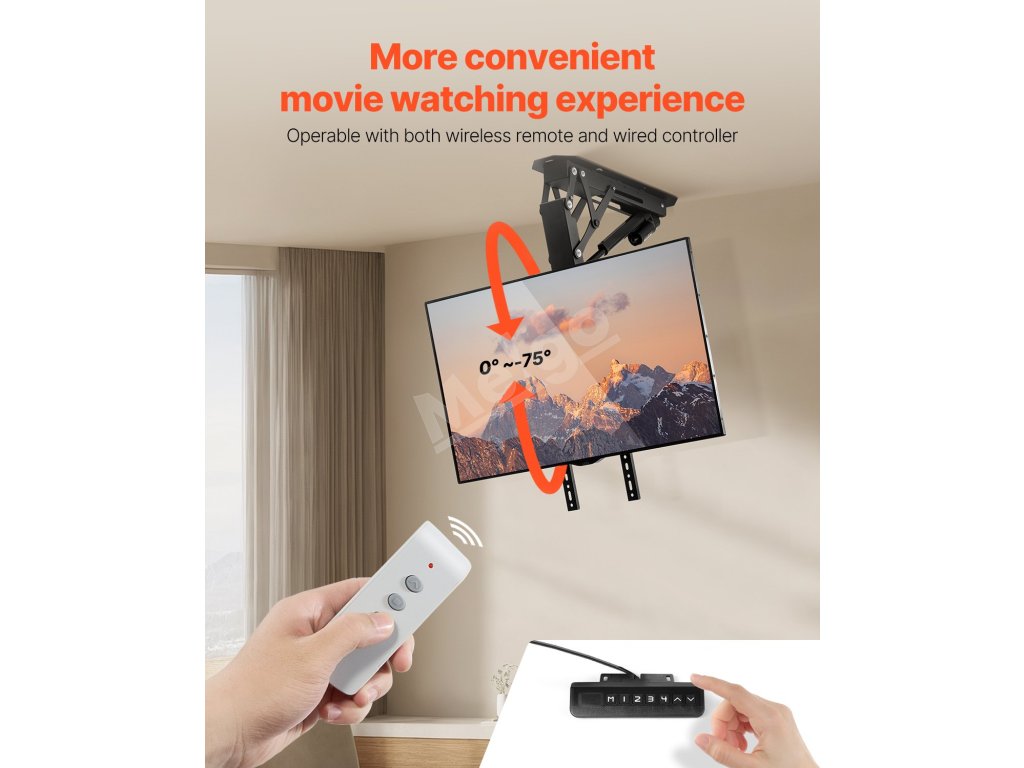 Tento stropný držiak televízora šetrí miesto vďaka stropnej inštalácii. Jeho robustná konštrukcia udrží hmotnosť televízora a diaľkovo ovládaný zdvihák umožňuje flexibilné nastavenie výšky, čím sa zabezpečí optimálny pozorovací uhol v rôznych nastaveniach.