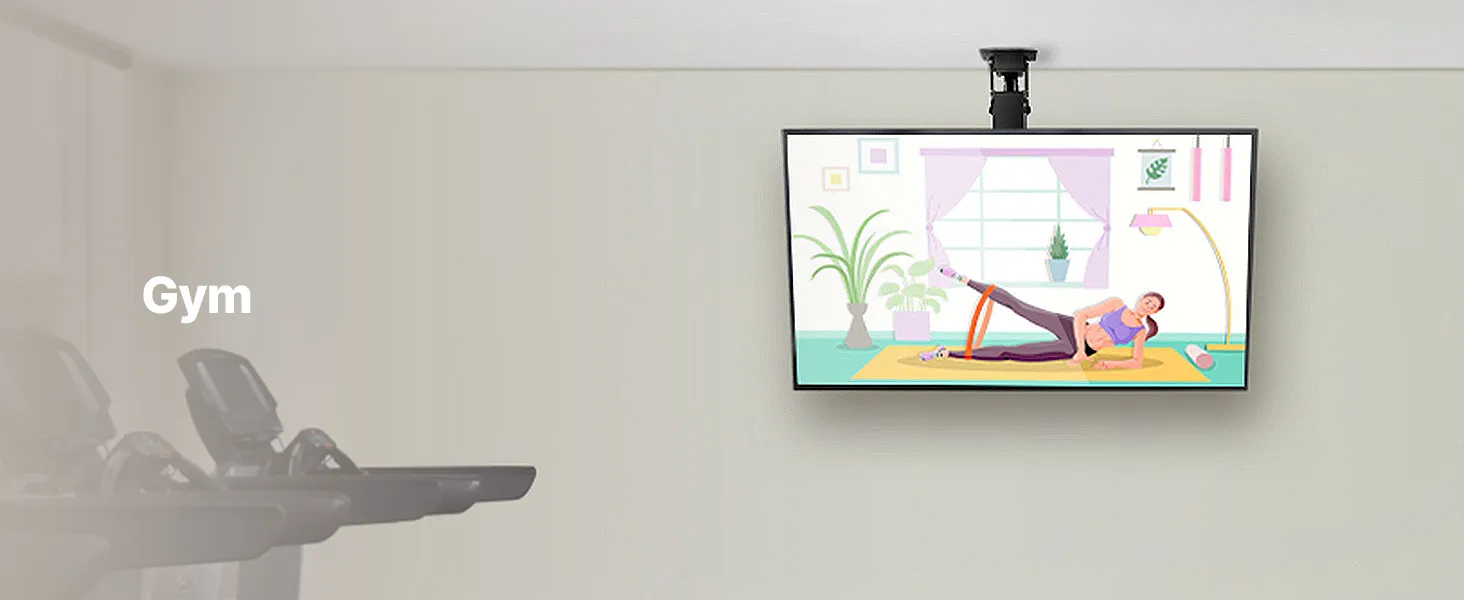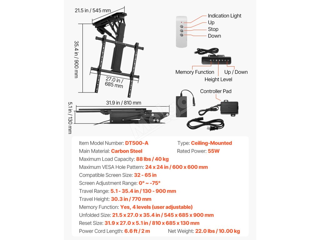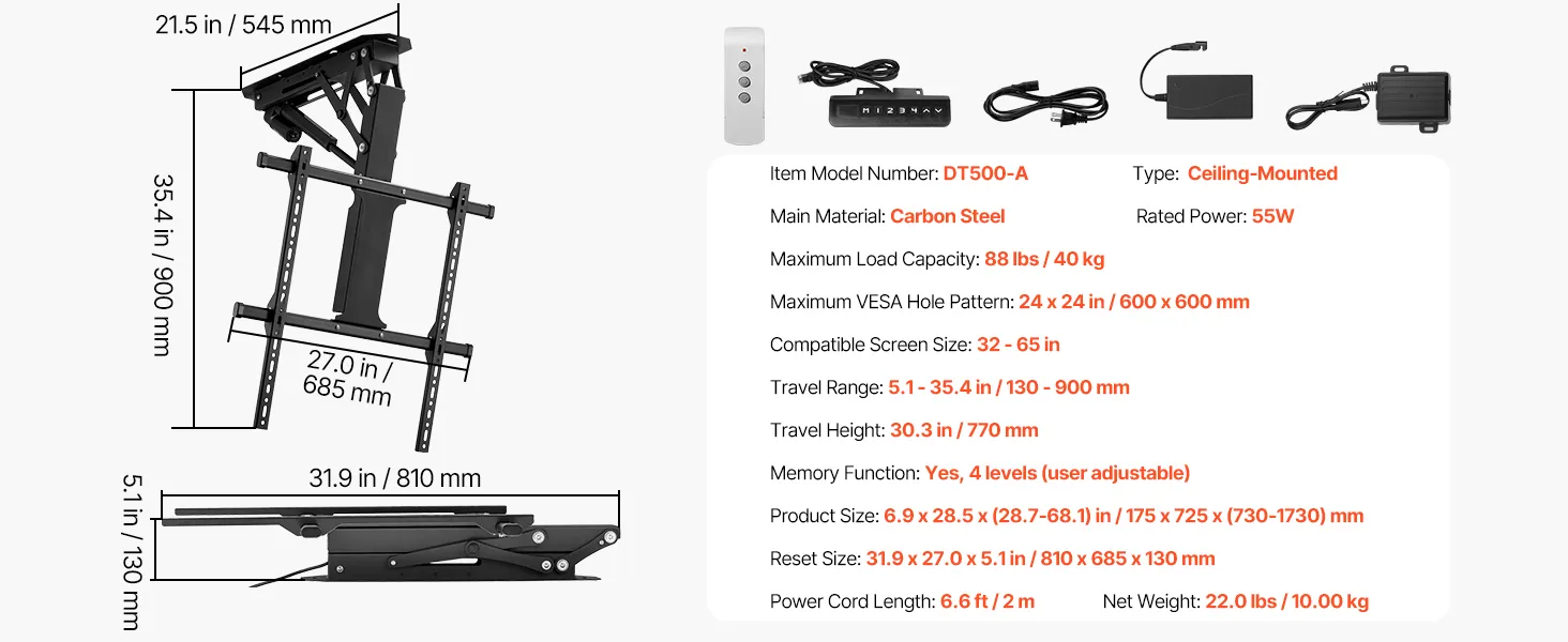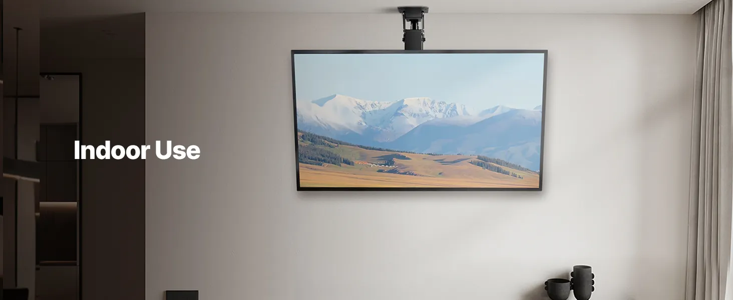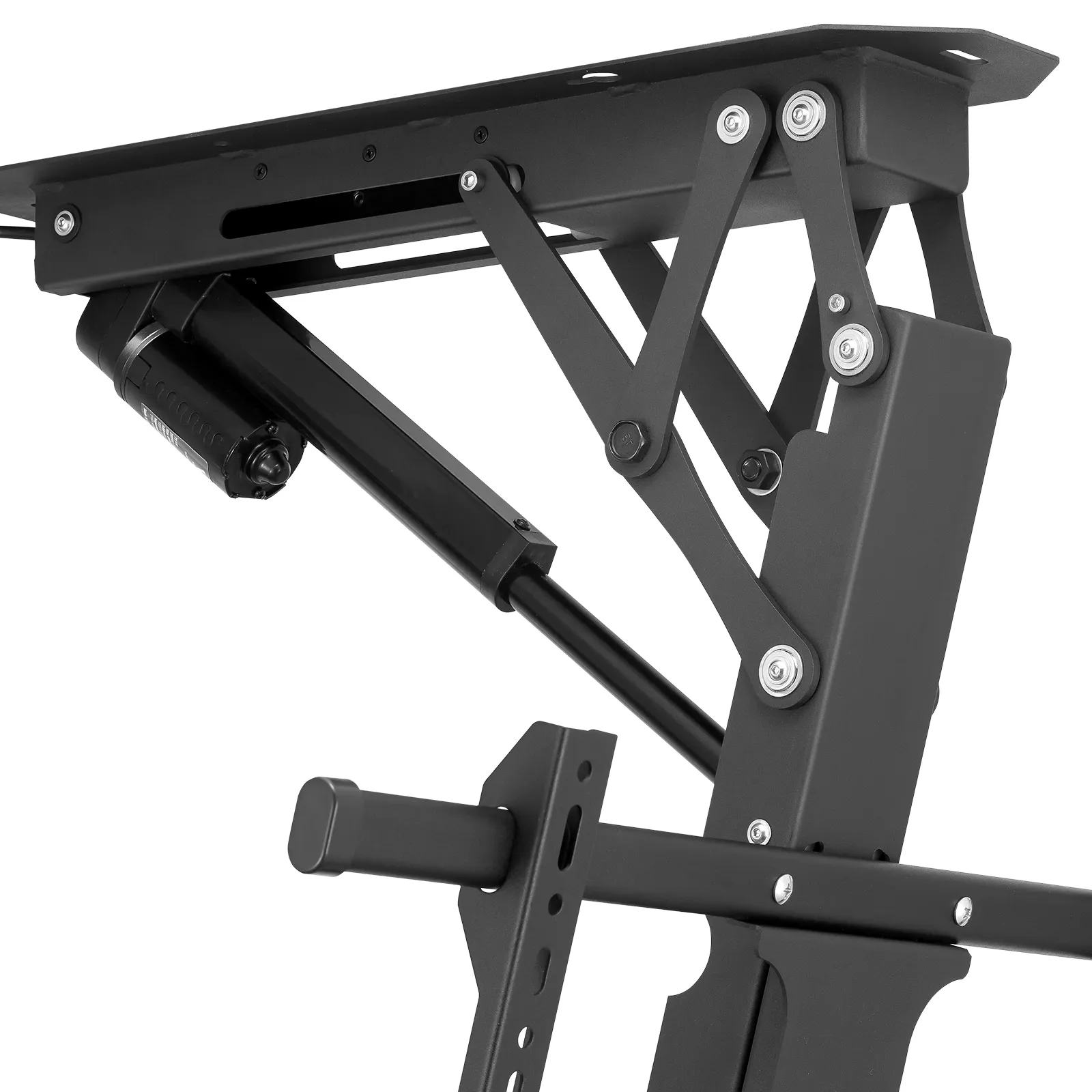 Tento stropný držiak televízora šetrí miesto vďaka stropnej inštalácii. Jeho robustná konštrukcia udrží hmotnosť televízora a diaľkovo ovládaný zdvihák umožňuje flexibilné nastavenie výšky, čím sa zabezpečí optimálny pozorovací uhol v rôznych nastaveniach.