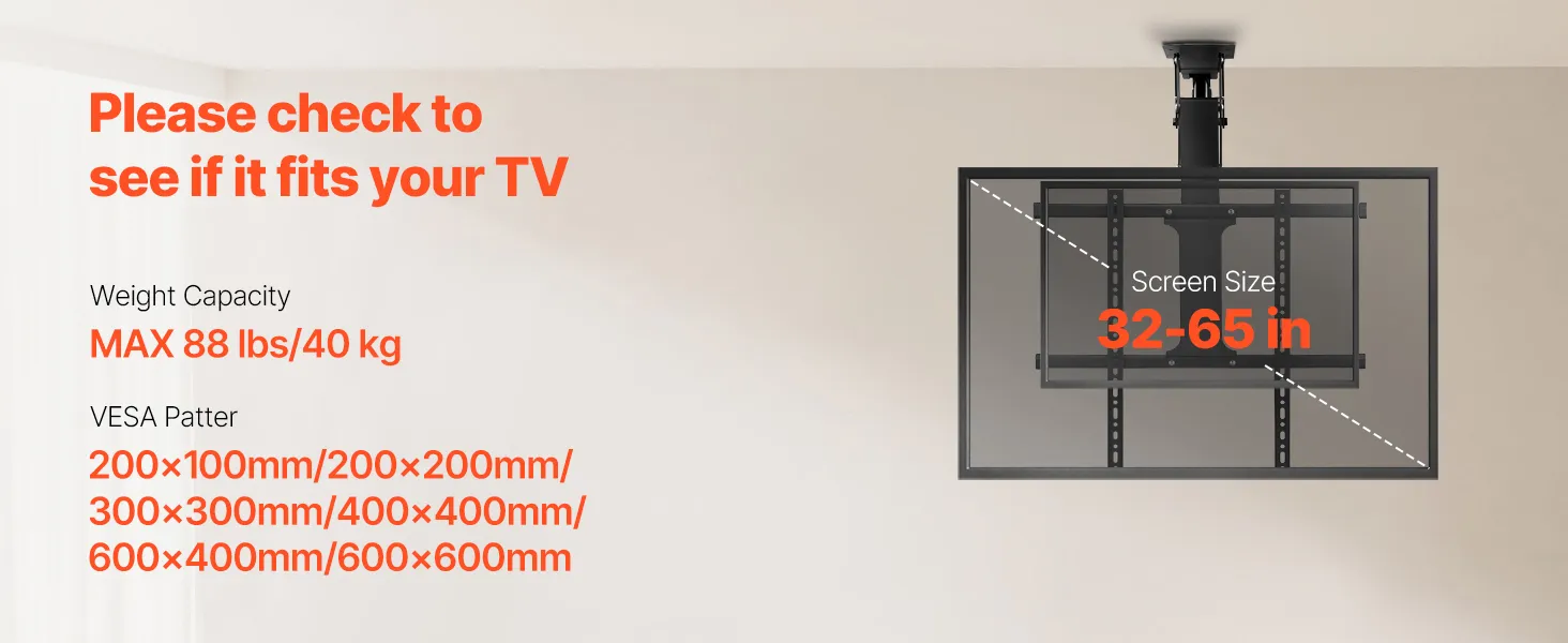 Motorický stropný držiak pre 32–65 inch tv, vesa 24×24 in, max 88 lbs