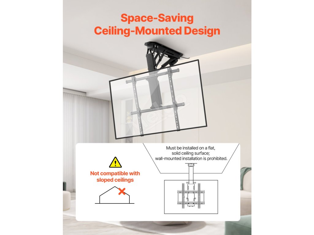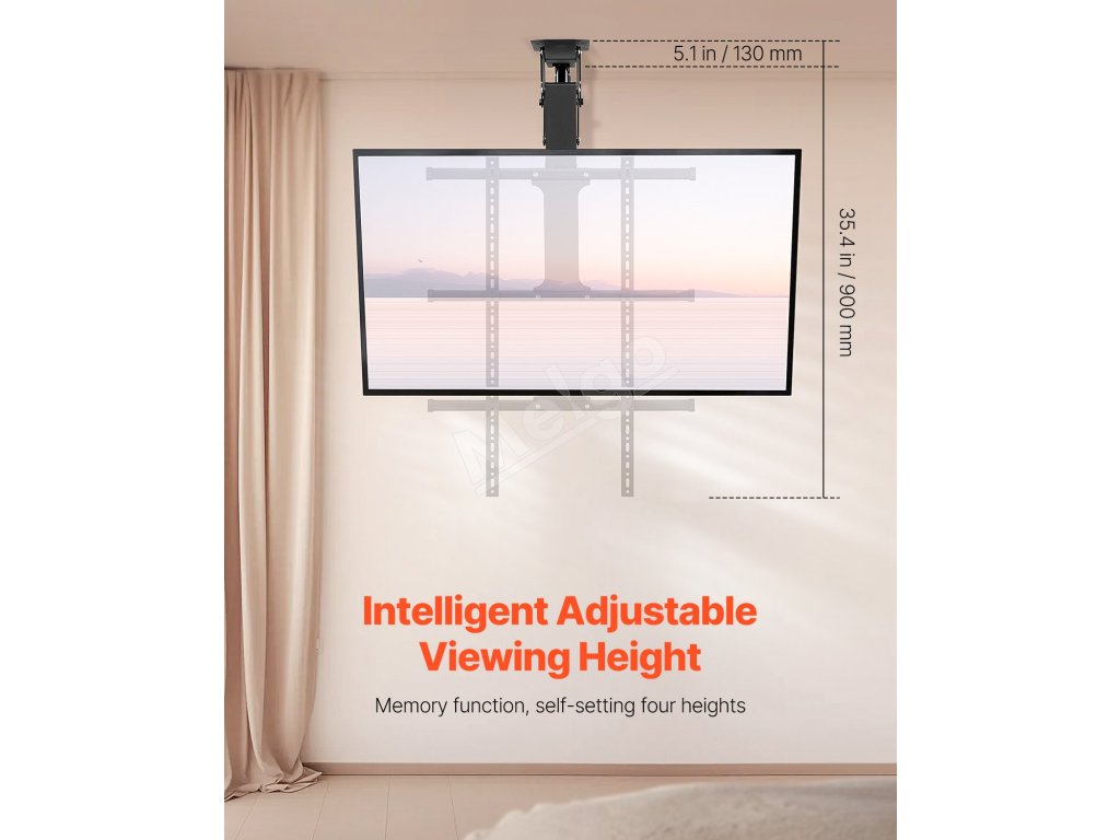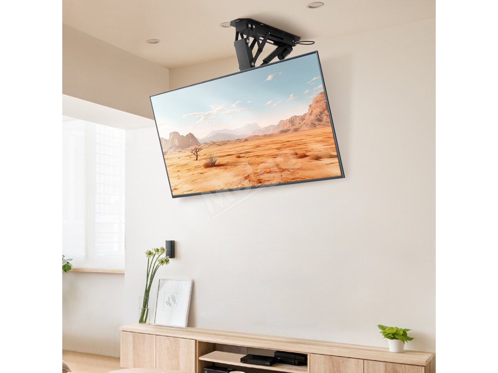 Tento stropný držiak televízora šetrí miesto vďaka stropnej inštalácii. Jeho robustná konštrukcia udrží hmotnosť televízora a diaľkovo ovládaný zdvihák umožňuje flexibilné nastavenie výšky, čím sa zabezpečí optimálny pozorovací uhol v rôznych nastaveniach.