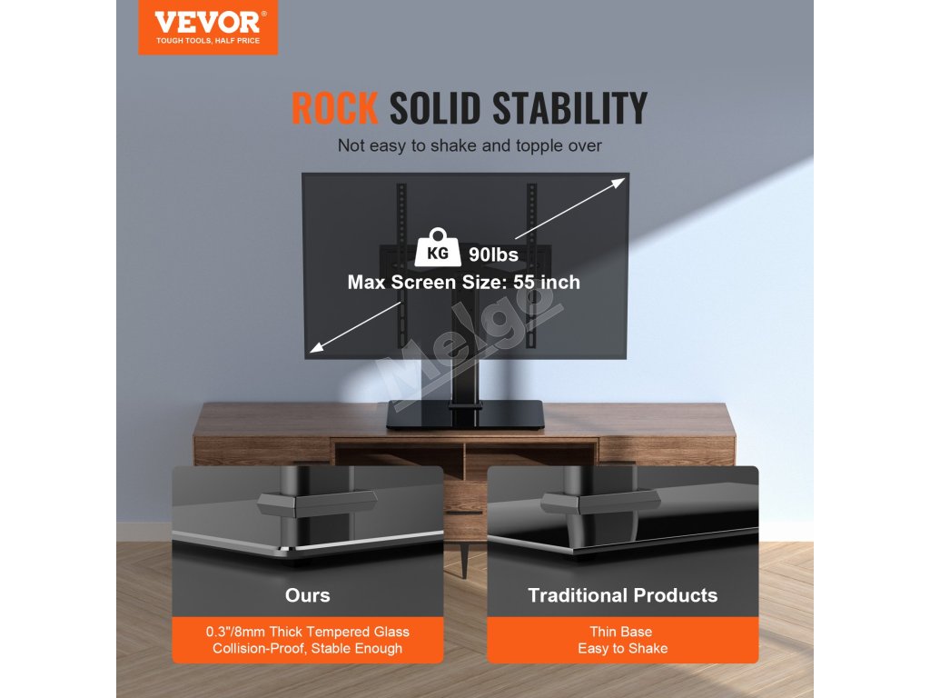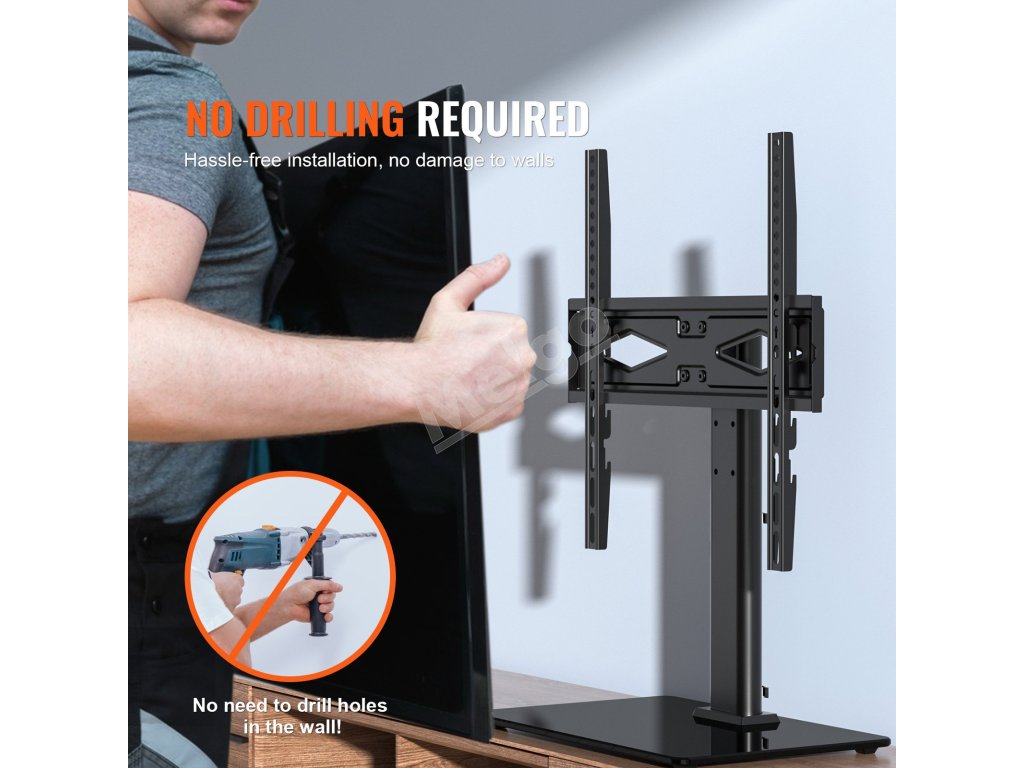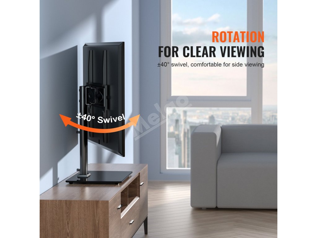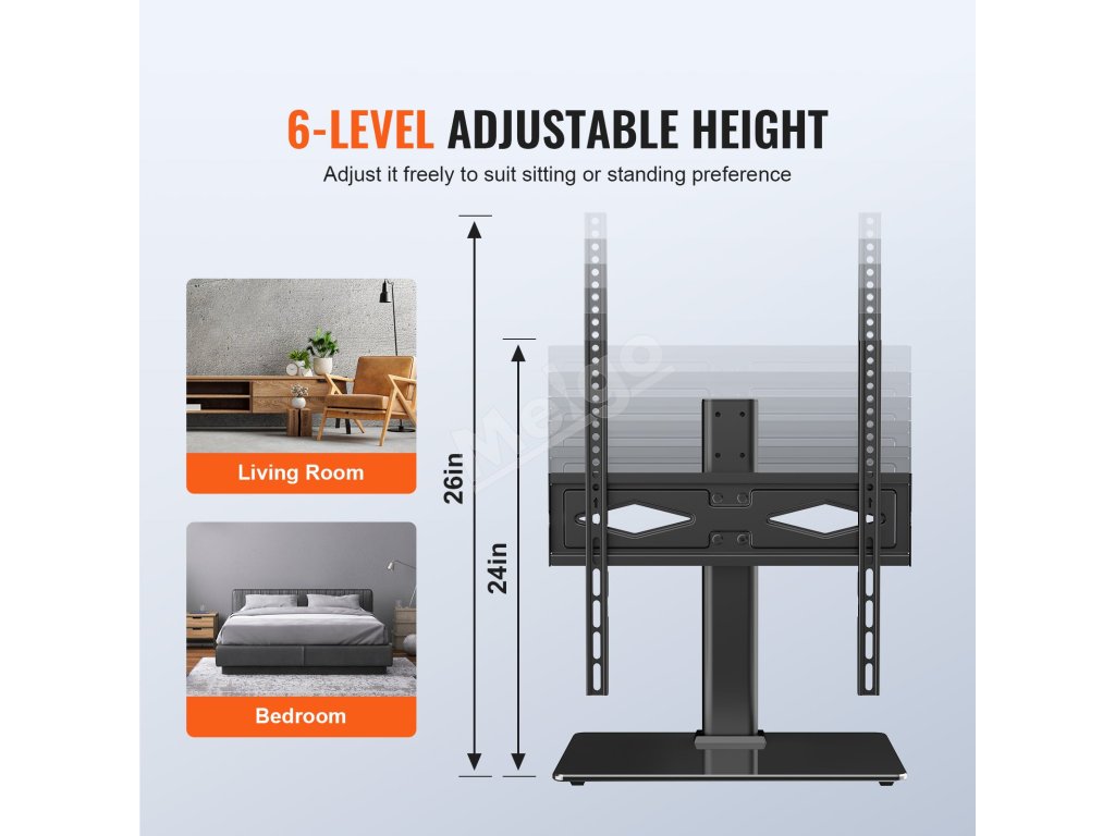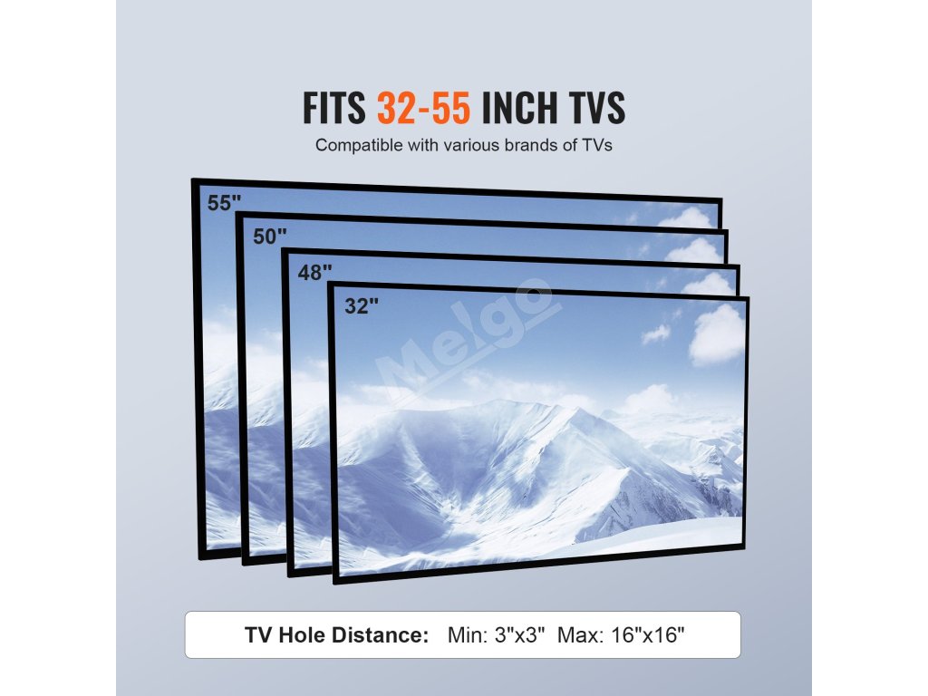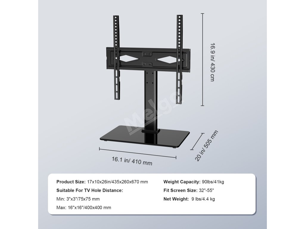 Držiak na TV stojan je kompatibilný so štandardom VESA od malých rozmerov 3 × 3 palce/75 × 75 mm až po veľké rozmery 16 × 16 palcov/400 × 400 mm, takže sa hodí na televízory s uhlopriečkou 32-55 palcov.