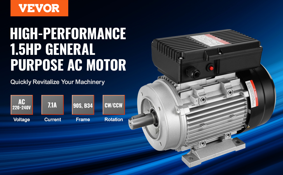 Vtlačte do svojho zariadenia silný výkon pomocou elektrického motora VEVOR 1,1 kW. Pracuje pri striedavom napätí 220~240 V s prúdom 7,1 A, má vysoké otáčky 2800 ot/min, 90S, rám B34, dĺžku hriadeľa 50 mm, hriadeľ s 24 mm kľúčenkou a dvojitý smer otáčania CW/CCW.