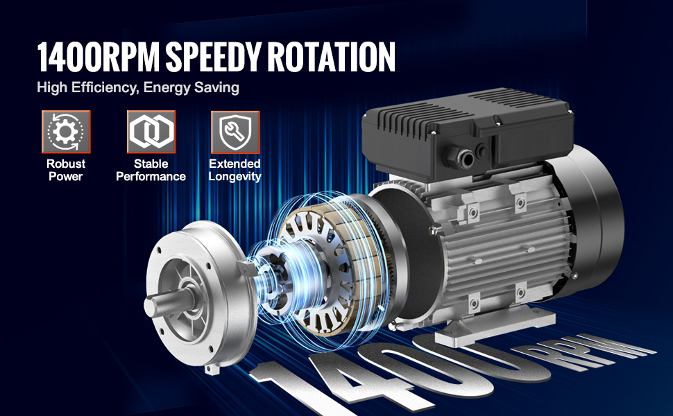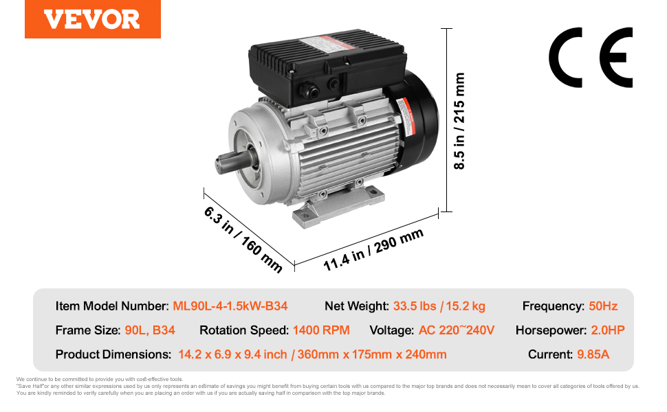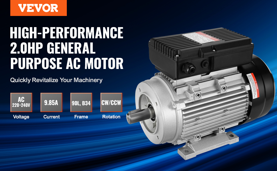 Dodajte svojmu zariadeniu silný výkon pomocou 1,5 kW elektromotora VEVOR. Pracuje pri striedavom napätí 220 ~ 240 V s prúdom 9,85 A, má vysoké otáčky 1400 ot/min, 90 L, rám B34, dĺžku hriadeľa 50 mm, hriadeľ s 24 mm kľúčenkou a dvojitý smer otáčania CW/CCW.