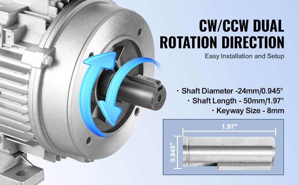Vďaka dvojitému smeru otáčania CW/CCW sa tento motor vzduchového kompresora ľahko inštaluje a je užívateľsky prívetivý. S priemerom hriadeľa 24 mm, dĺžkou hriadeľa 50 mm a drážkou s kľúčom 8 mm sa ľahko pripája k rôznym zariadeniam a ponúka veľkú všestrannosť pre rôzne aplikácie.