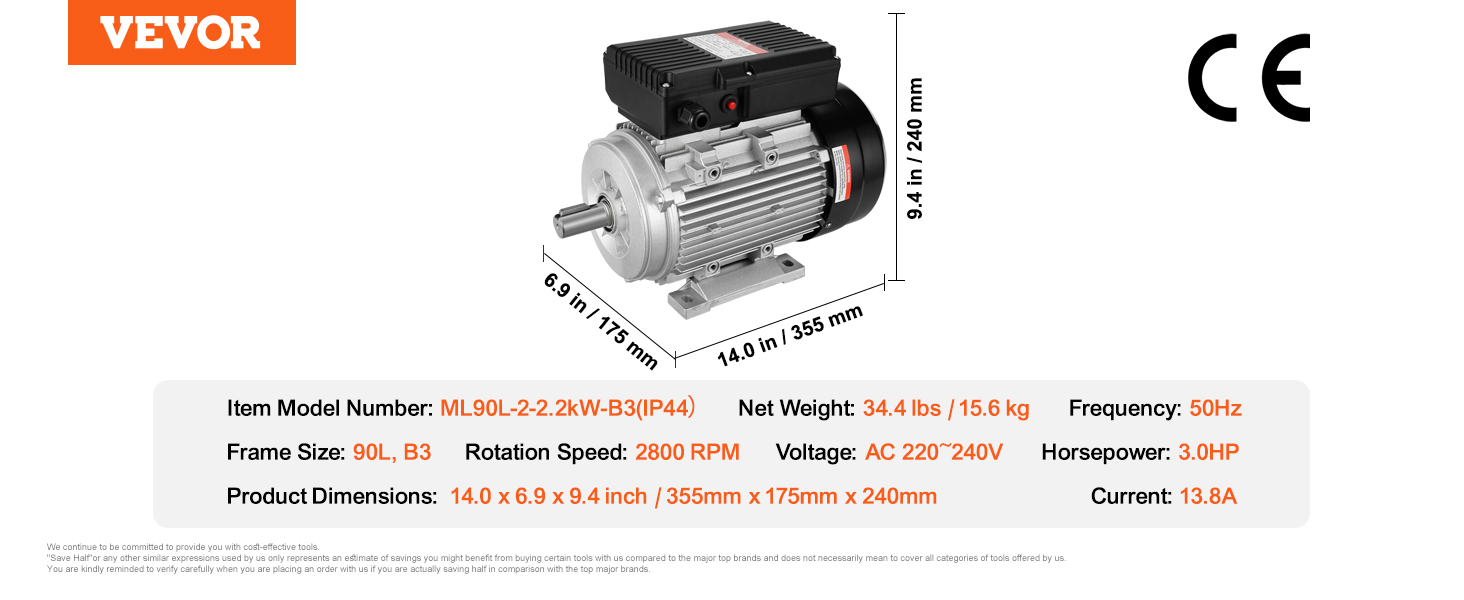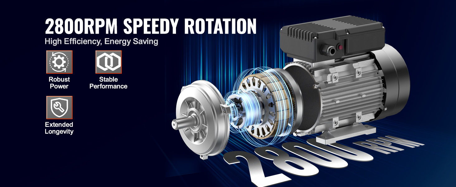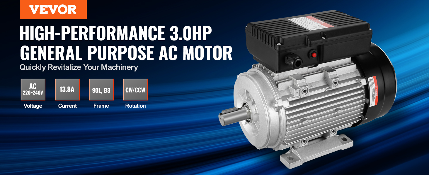 Vtlačte do svojho zariadenia silný výkon pomocou elektrického motora VEVOR 2,2 kW. Pracuje pri striedavom napätí 220 ~ 240 V s prúdom 13,8 A, má vysoké otáčky 2800 ot/min, 90 L, rám B3, dĺžku hriadeľa 50 mm, hriadeľ s 24 mm kľúčenkou a dvojitý smer otáčania CW/CCW.