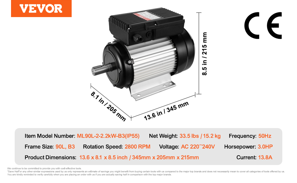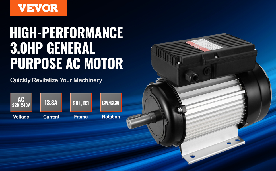 Vtlačte do svojho zariadenia silný výkon pomocou elektrického motora VEVOR 2,2 kW. Pracuje pri striedavom napätí 220 ~ 240 V s prúdom 13,8 A, má vysoké otáčky 2800 ot/min, 90 L, rám B3, dĺžku hriadeľa 50 mm, hriadeľ s 24 mm kľúčenkou a dvojitý smer otáčania CW/CCW.