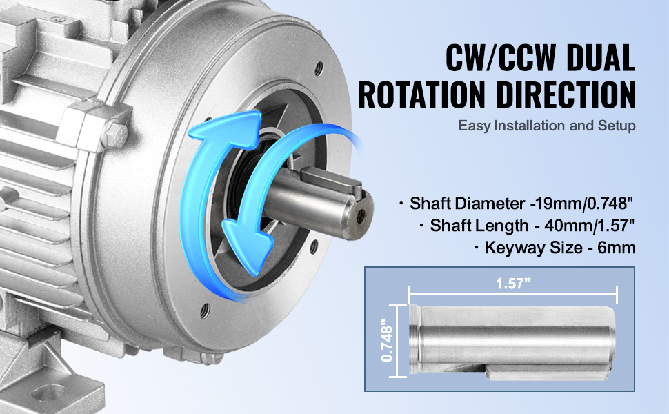 Vďaka dvojitému smeru otáčania CW/CCW sa tento motor vzduchového kompresora ľahko inštaluje a je užívateľsky prívetivý. S priemerom hriadeľa 19 mm, dĺžkou hriadeľa 40 mm a drážkou s kľúčom 6 mm sa ľahko pripája k rôznym zariadeniam a ponúka veľkú všestrannosť pre rôzne aplikácie.