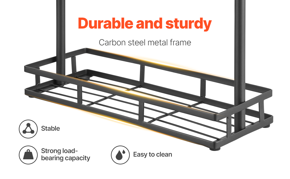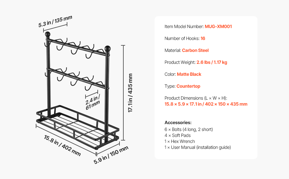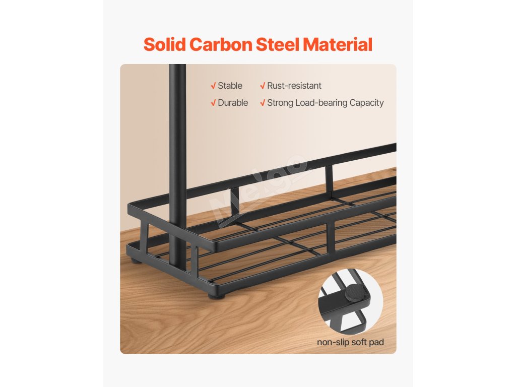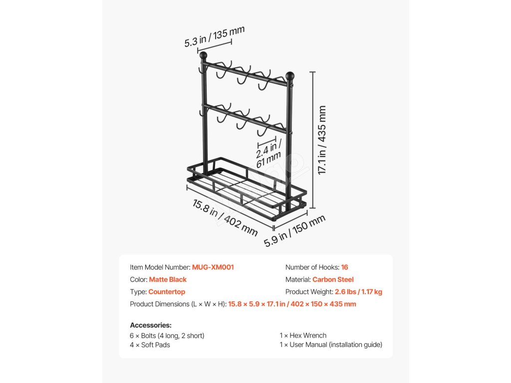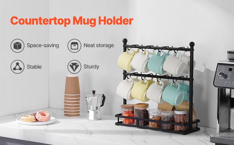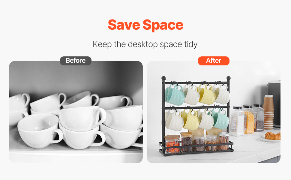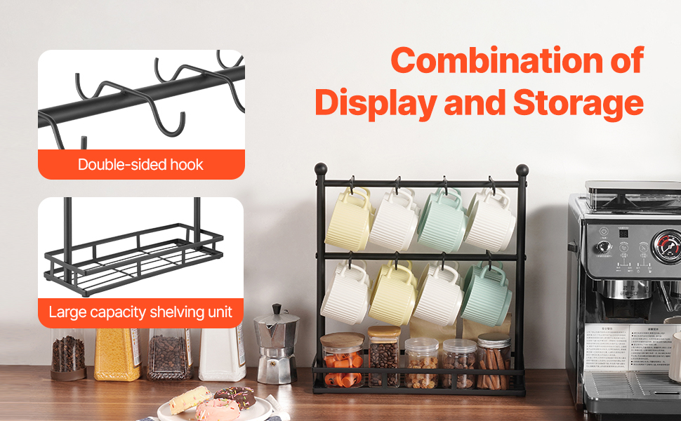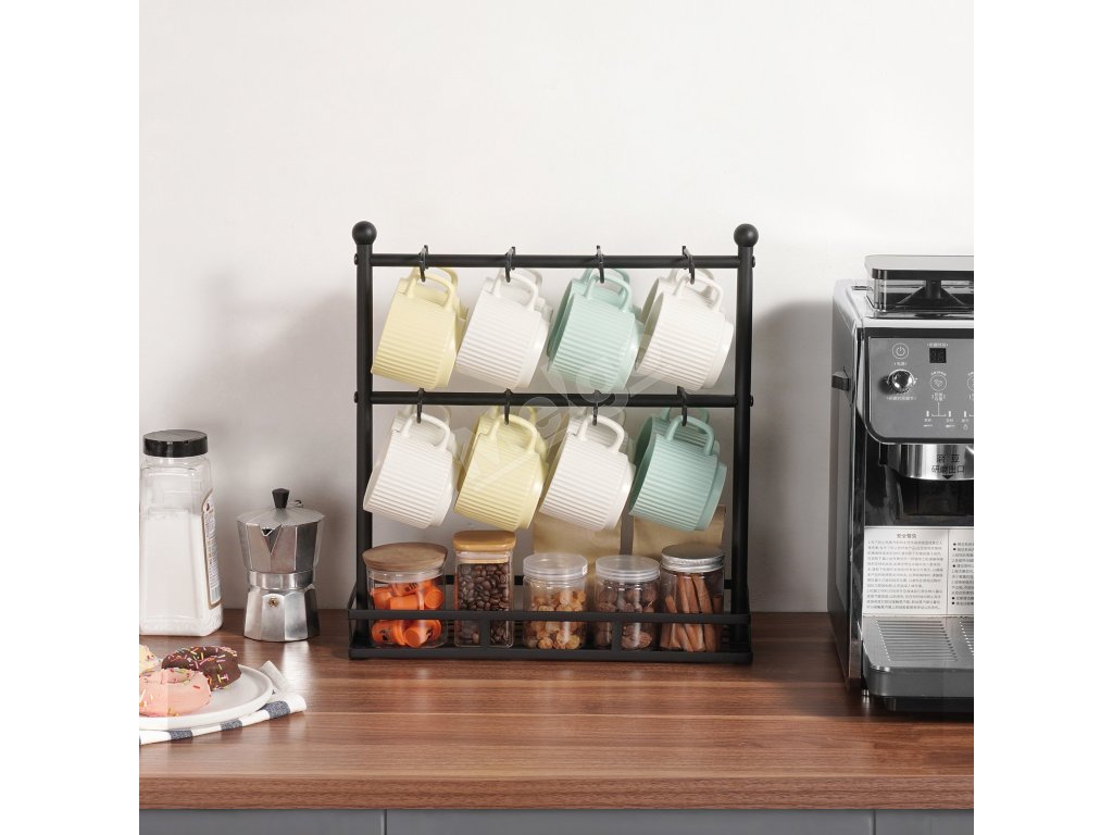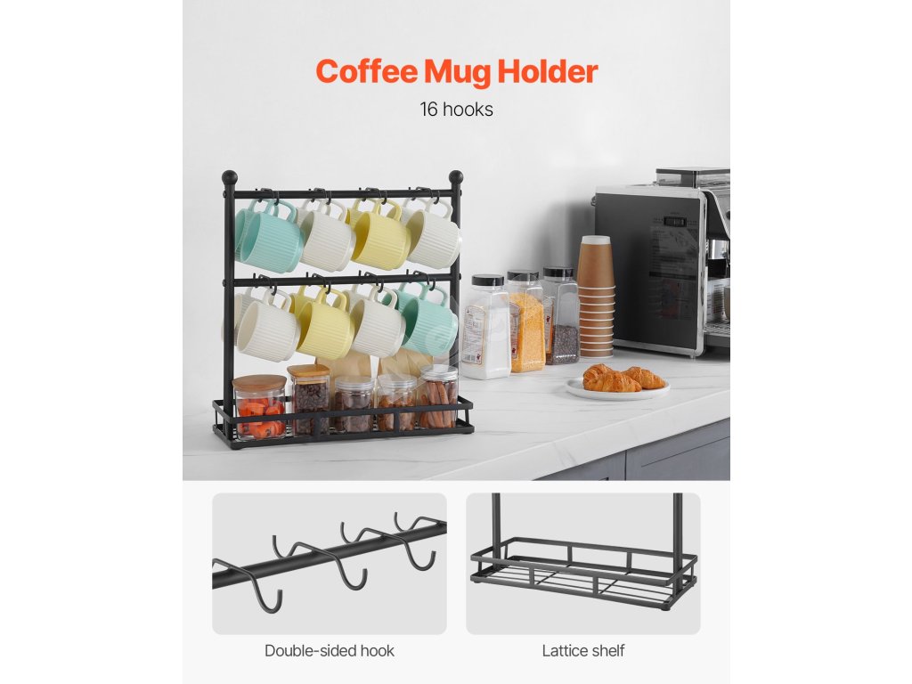 Stojan na hrnčeky je vybavený obojstrannými háčikmi, ktoré dokážu pojať až 16 hrnčekov na kávu. Veľkokapacitná odkladacia základňa je ideálna na odkladanie ďalších predmetov a ponúka vynikajúcu úložnú kapacitu.