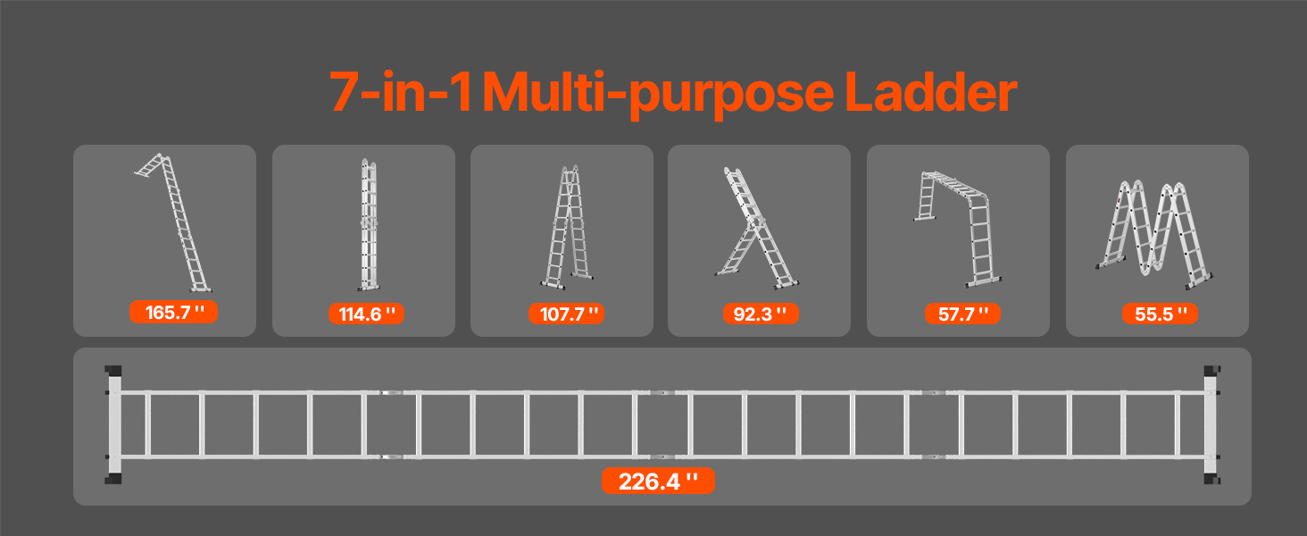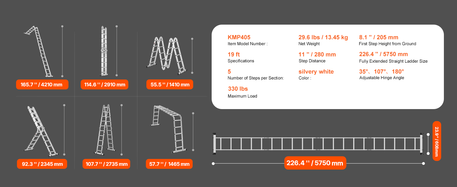 Tento rebrík sa dá ľahko premeniť na rám v tvare písmena A, rám v tvare písmena M, rebrík, rám v tvare písmena L, plošinu, sklopný a rovný tvar, čo poskytuje bezkonkurenčnú všestrannosť na širokú škálu úloh.