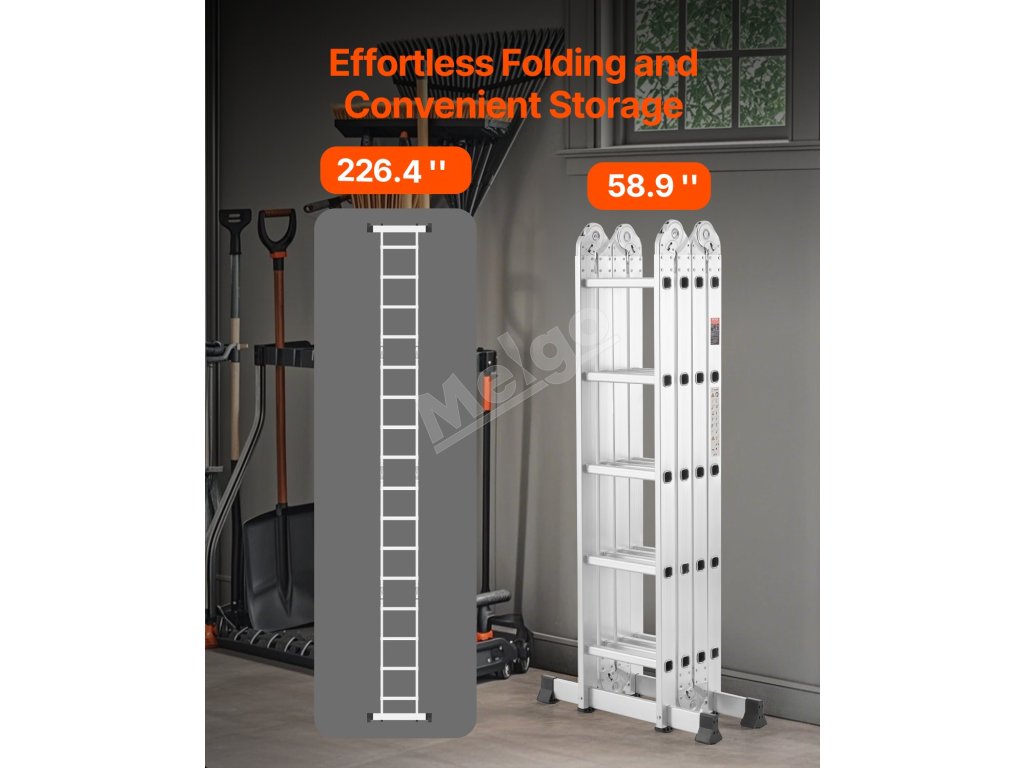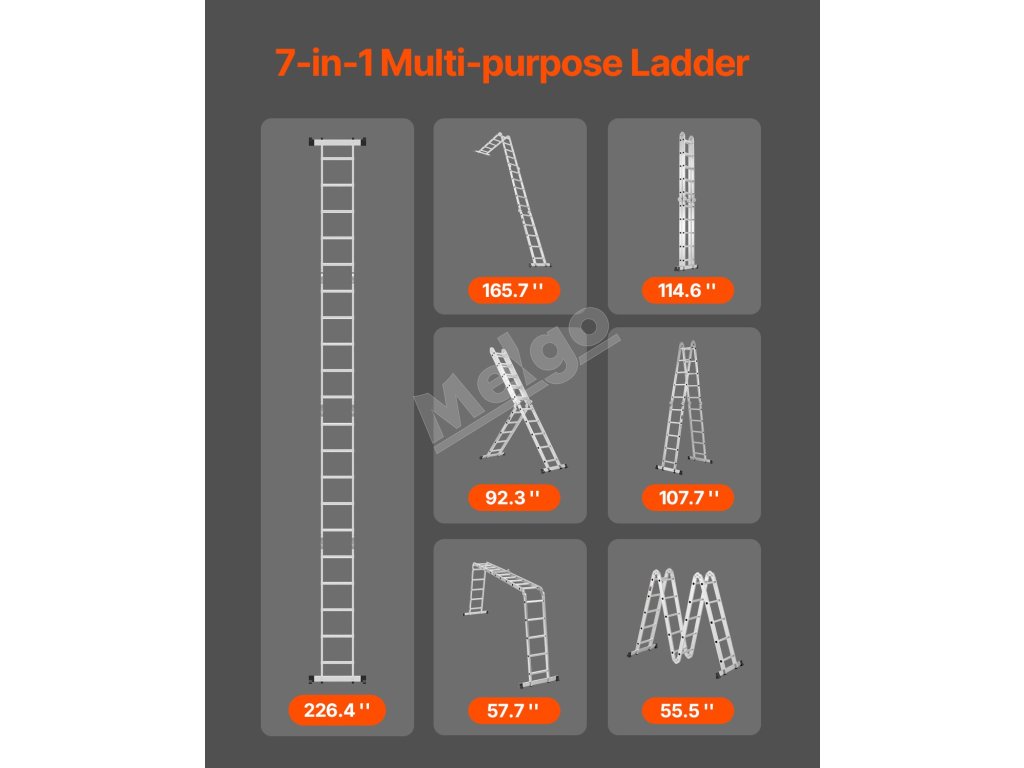 Tento rebrík sa dá ľahko premeniť na rám v tvare písmena A, rám v tvare písmena M, rebrík, rám v tvare písmena L, plošinu, sklopný a rovný tvar, čo poskytuje bezkonkurenčnú všestrannosť na širokú škálu úloh.