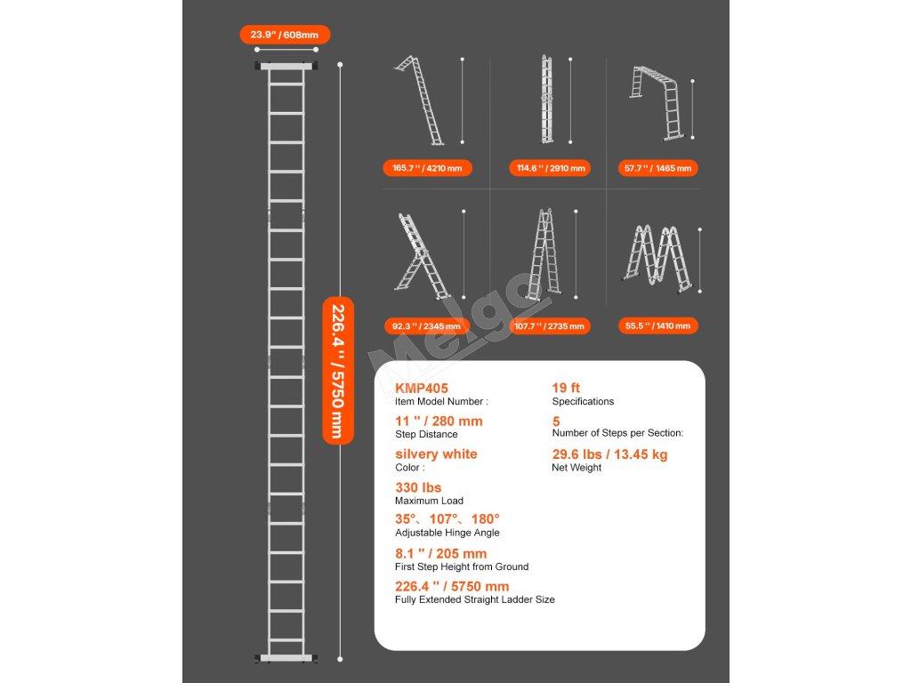 Skladací rebrík 7 v 1, 5-stupňový, výška 19ft, nosnosť 330 lbs