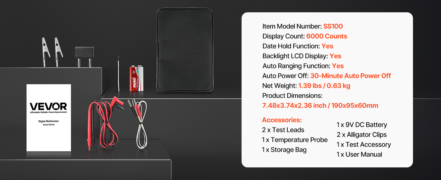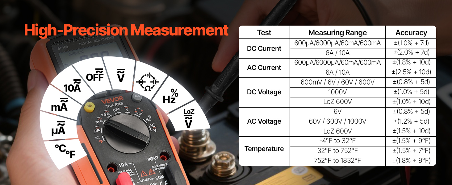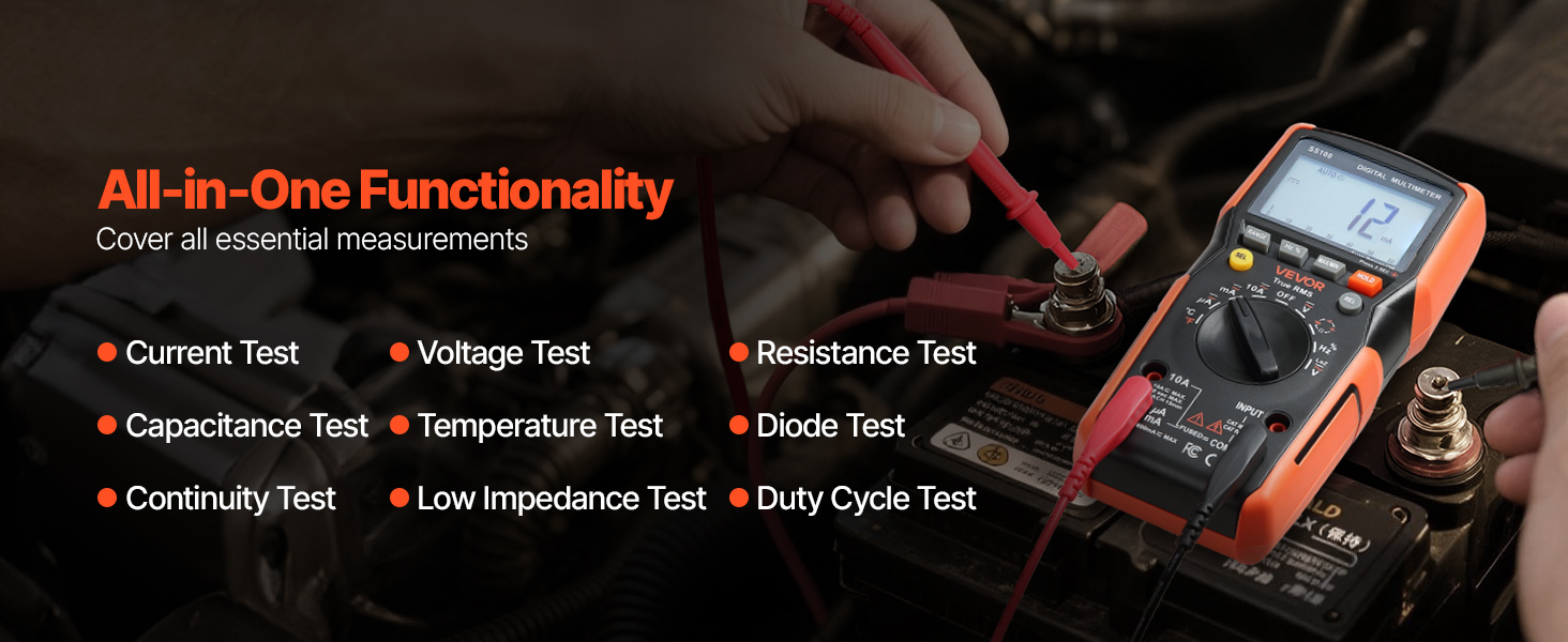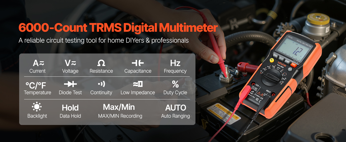 Digitálny multimeter VEVOR 6000 s TRMS podporuje testovanie prúdu, napätia, odporu, kapacity, frekvencie, teploty, diód, spojitosti, nízkej impedancie a pracovného cyklu. Vďaka technológiám Auto Ranging a True RMS dokáže presne merať skutočnú efektívnu hodnotu nesinusových priebehov.