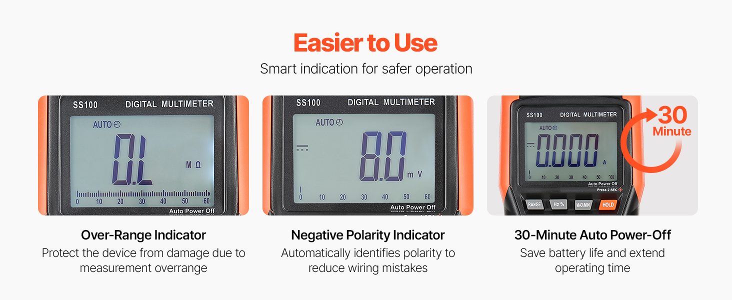 Podporuje automatickú indikáciu zápornej polarity, indikáciu prekročenia rozsahu, podržanie údajov, záznam maximálnej/minimálnej hodnoty, režim nízkej impedancie (LoZ) a 30-minútové automatické vypnutie - vďaka tomu sú merania pohodlnejšie a presnejšie.