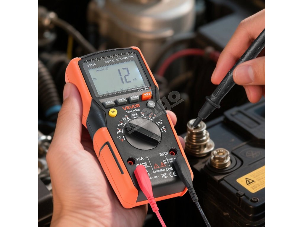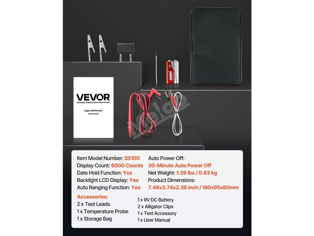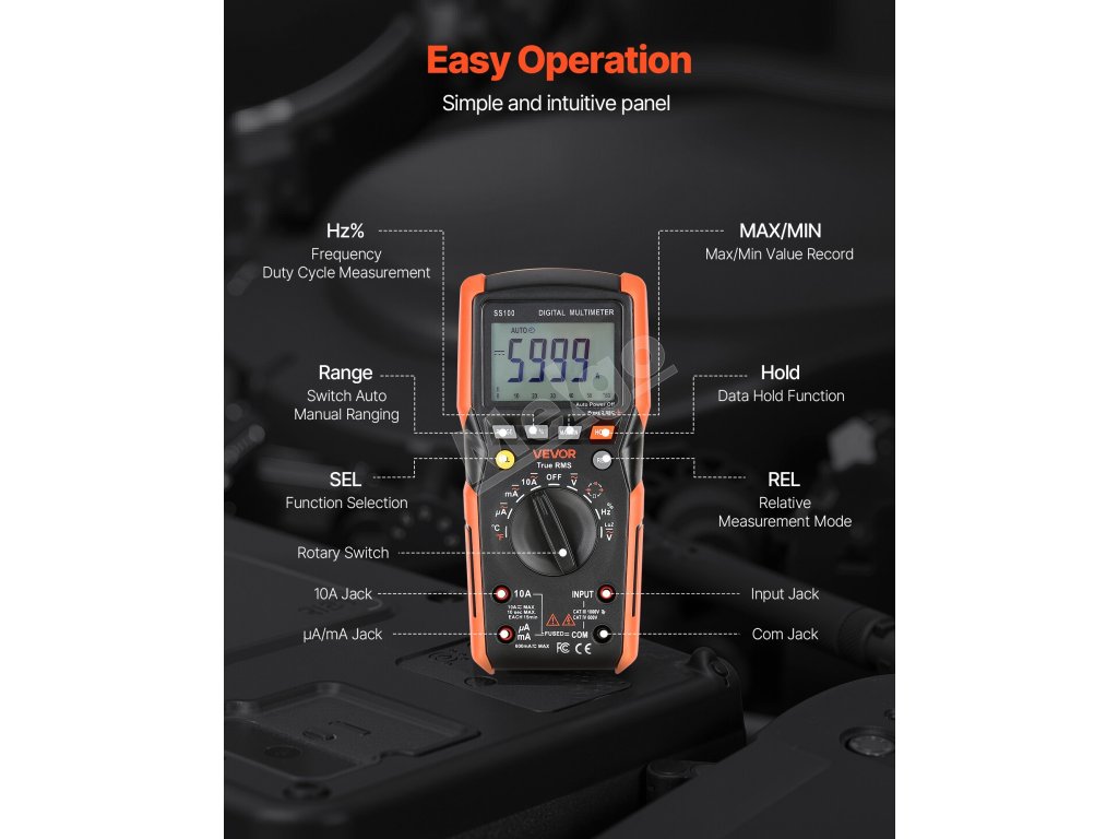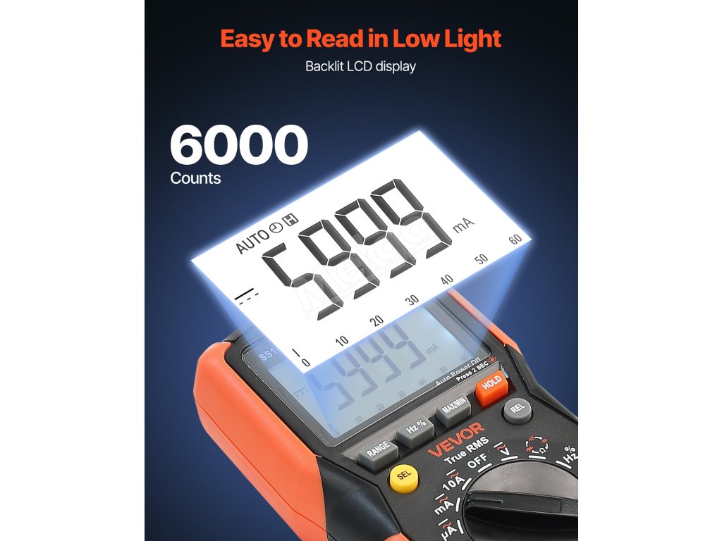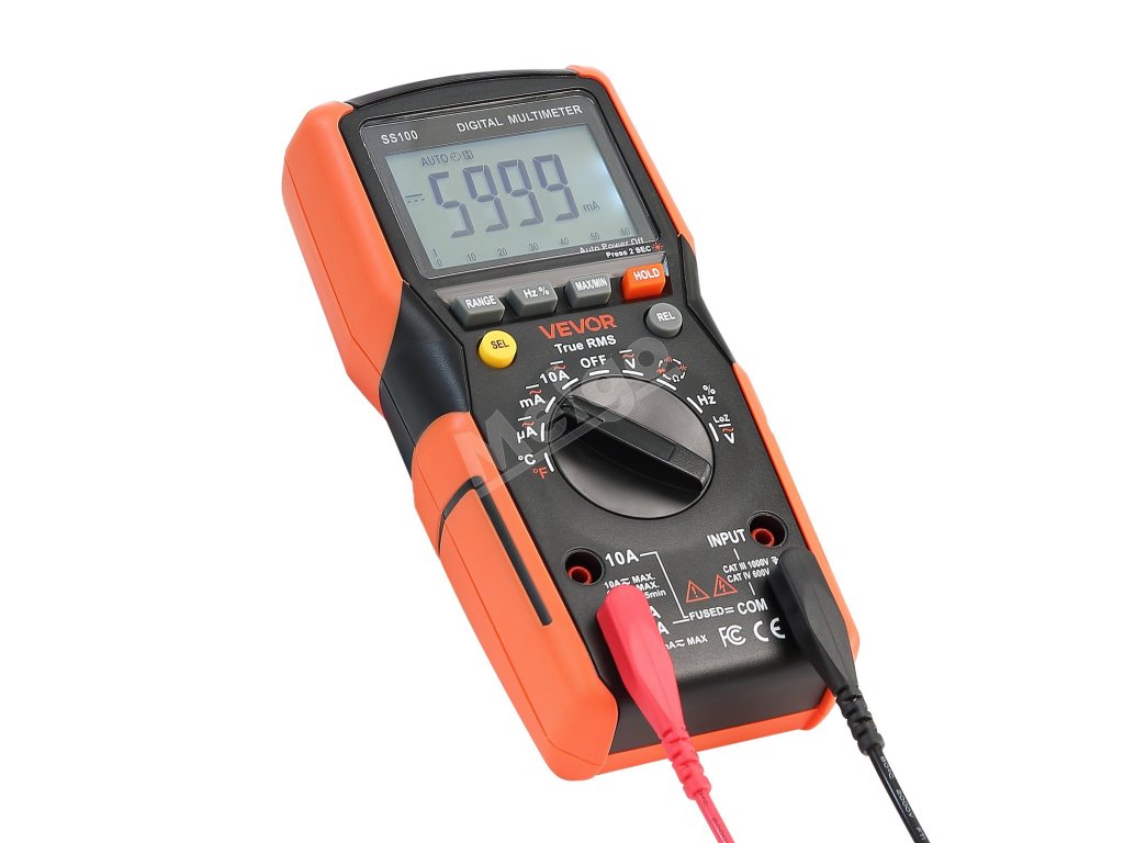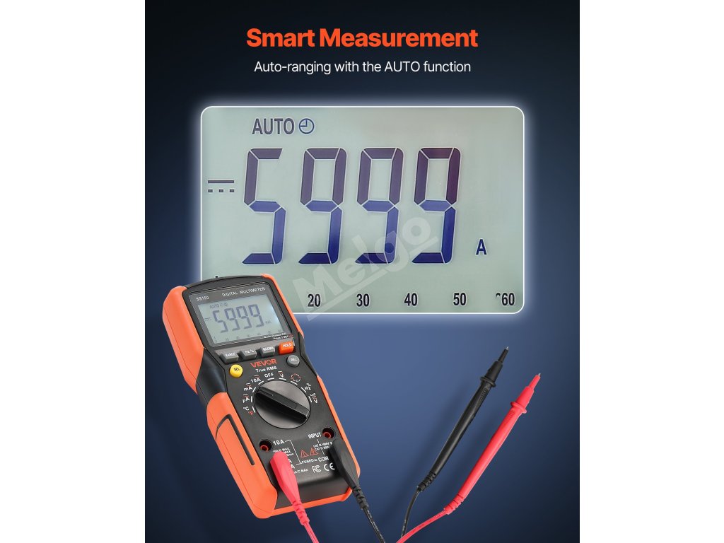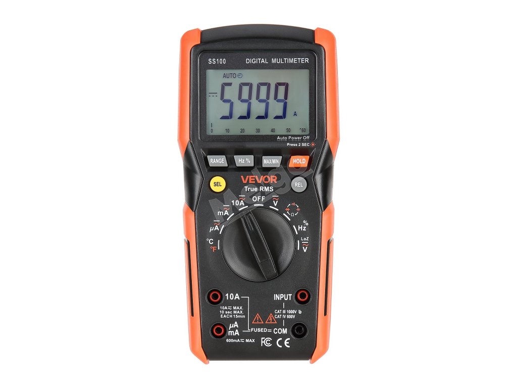 Digitálny multimeter VEVOR 6000 s TRMS podporuje testovanie prúdu, napätia, odporu, kapacity, frekvencie, teploty, diód, spojitosti, nízkej impedancie a pracovného cyklu. Vďaka technológiám Auto Ranging a True RMS dokáže presne merať skutočnú efektívnu hodnotu nesinusových priebehov.