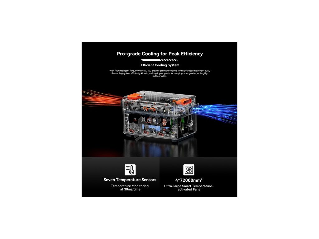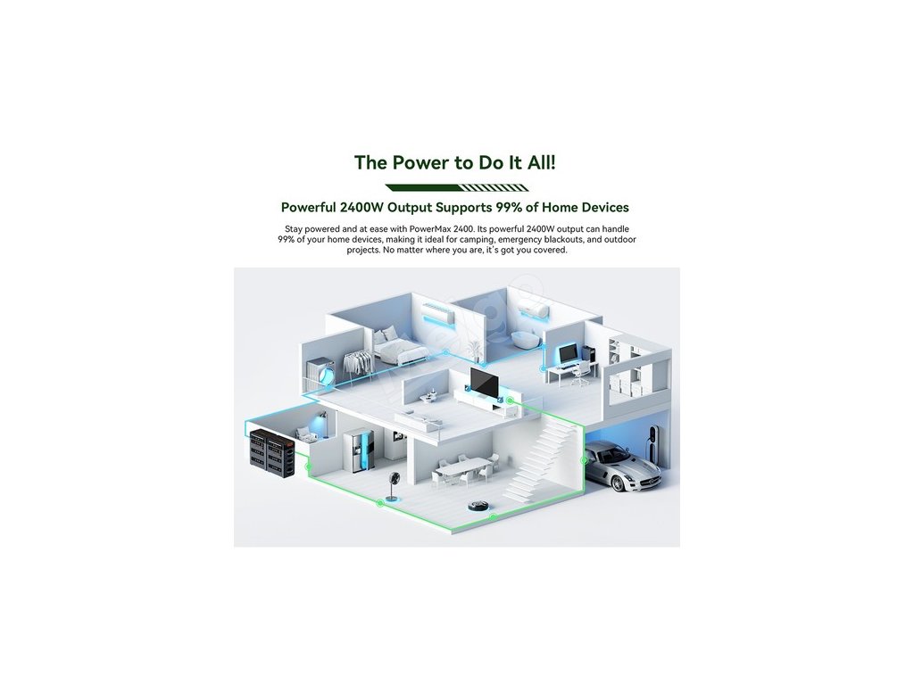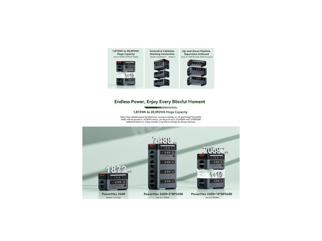 PowerMax 2400 je vybavený výkonnou 1 872Wh batériou, ktorú možno rozšíriť až na 20 592Wh pomocou 10 ďalších batérií BP2400. Užívajte si spoľahlivú a dlhotrvajúcu energiu pre všetky svoje zariadenia.