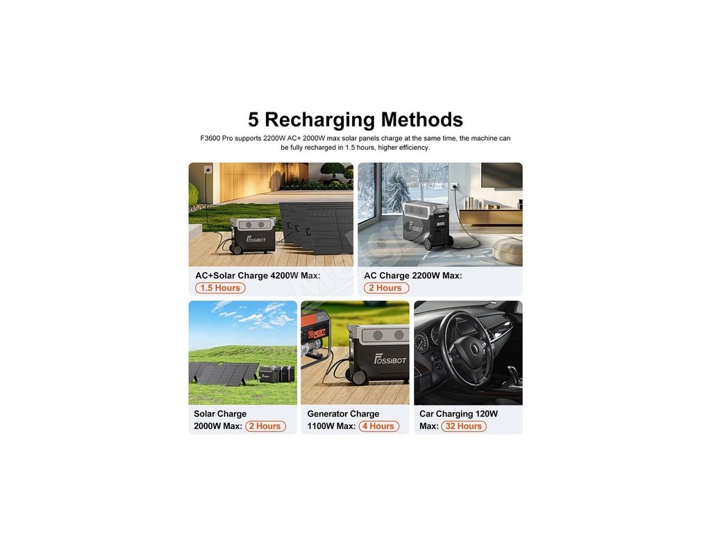 Vychutnajte si flexibilitu nabíjania rozširujúcej batérie FB3840 buď prostredníctvom 200W solárneho napájania, alebo cez štandardnú zásuvku striedavého prúdu. Vďaka tejto možnosti dvojitého nabíjania je ideálny na dobrodružstvá mimo siete aj na domáce použitie.