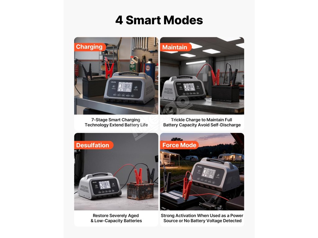 Táto nabíjačka batérií disponuje 4 inteligentnými režimami a pokrýva všetko od každodenného inteligentného nabíjania až po dlhodobú údržbu, regeneráciu starých batérií a nútené nabíjanie na aktiváciu „vybitých“ batérií s napätím pod 1 V. Vďaka šiestim ochranným funkciám a technológii tepelnej kompenzácie zabezpečuje bezpečné nabíjanie.