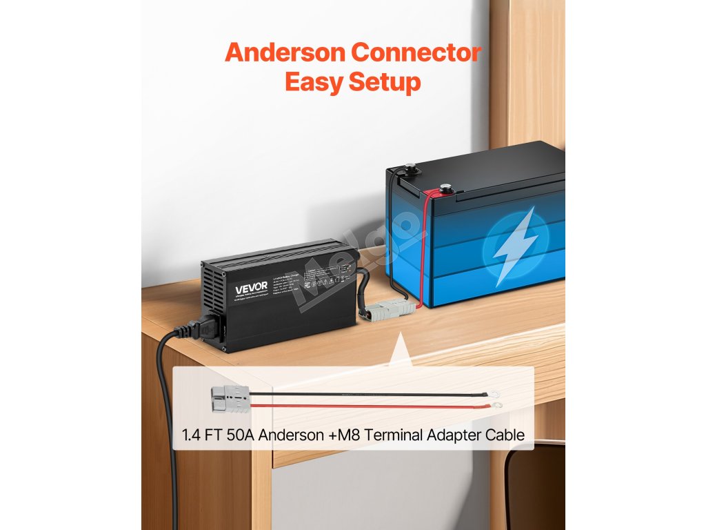 Naša inteligentná nabíjačka LiFePO4 umožňuje jednoduché pripojenie vďaka priloženému konektoru Anderson a káblu adaptéra svoriek M8 pre bezproblémové používanie.
