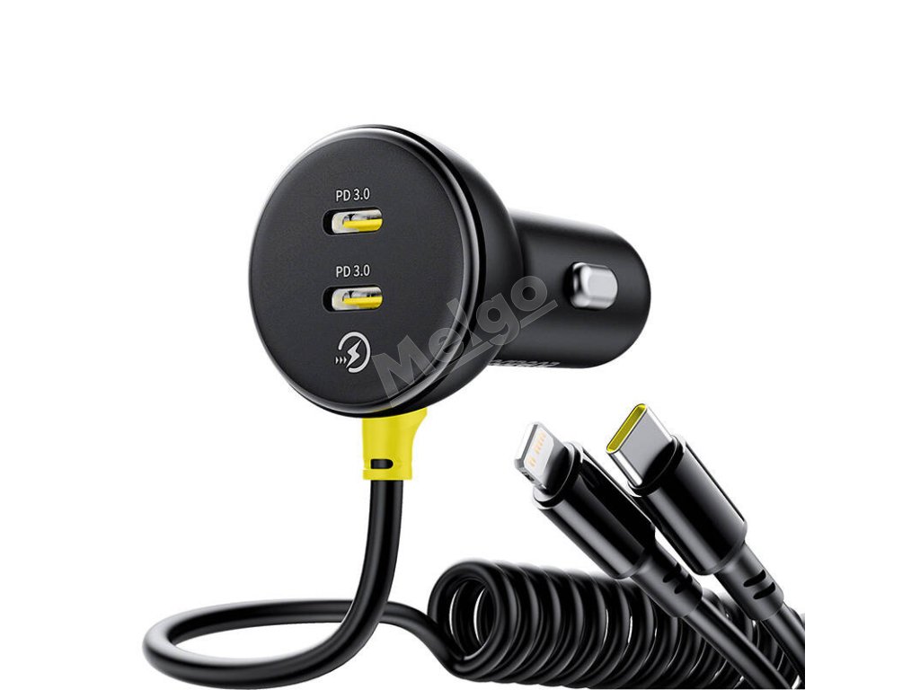 Zabudovaný 1,4-metrový kábel Lightning s funkciou pružinového navíjania poskytuje pohodlné používanie a poriadok v aute, zatiaľ čo ďalší port USB-C umožňuje rýchle nabíjanie zariadení so systémom iOS aj Android. Vstavané káble ponúkajú bleskové nabíjanie - napríklad pre iPhone 15 až na 52 % alebo Huawei Mate 60 Pro až na 65 % len za 30 minút.