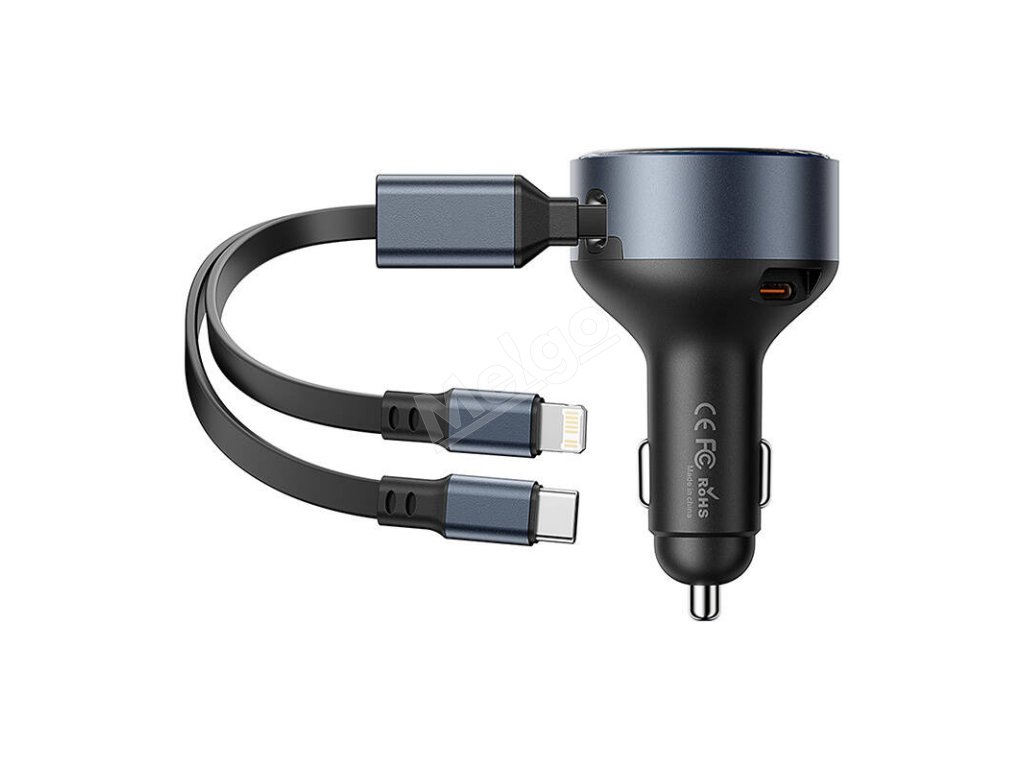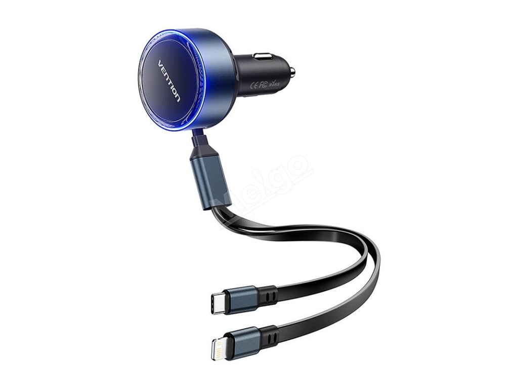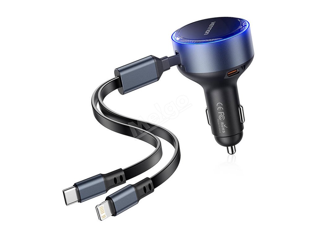 The Vention charger is a versatile solution for fast charging of three devices simultaneously, ideal for cars with 12-24V. With built-in USB-C and Lightning cables and an additional USB-C port, it provides great versatility and eliminates the mess of tangled wires.