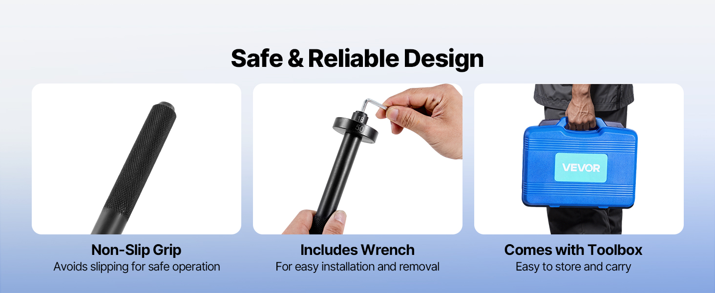 Táto súprava vodičov ložiskových tesnení, vyrobená z robustného kovu s čiernym povrchom odolným proti korózii, poskytuje dlhodobý výkon. Predĺžená a zhrubnutá rukoväť poskytuje lepší úchop na efektívnu demontáž ložiska.