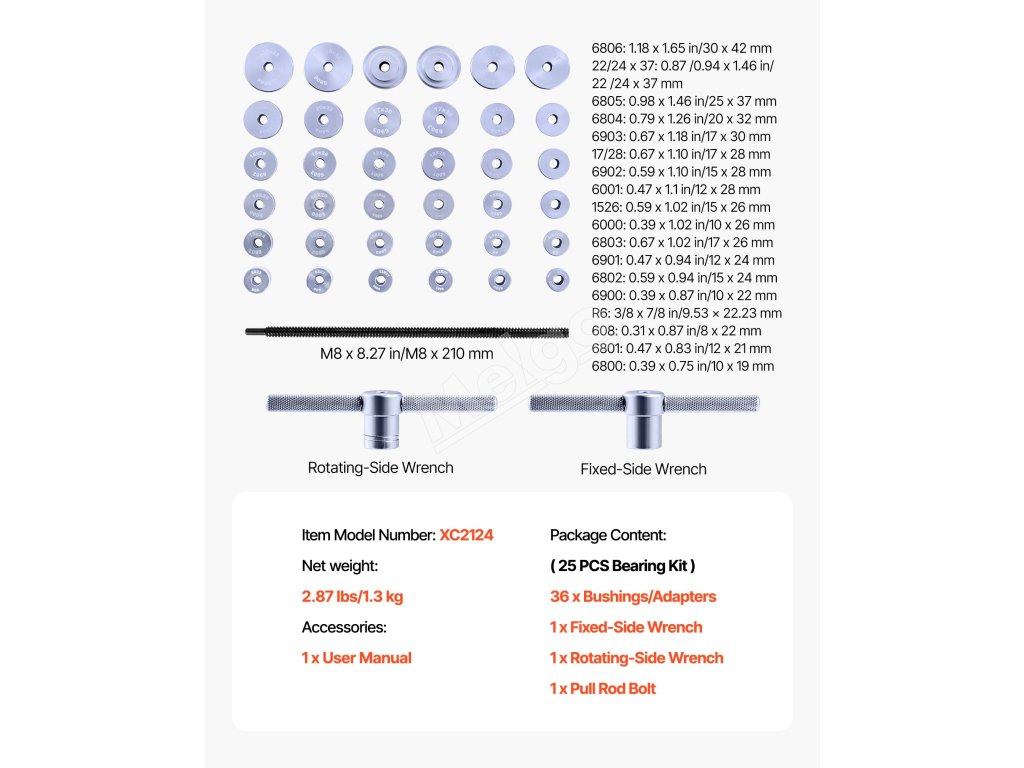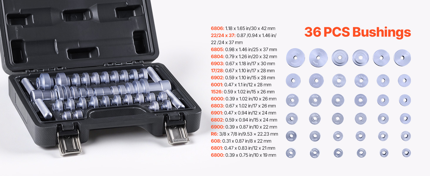 Súprava vodičov ložísk a tesnení obsahuje objímky kotúčov vo viacerých veľkostiach a kompletný montážny nástroj v balení. Naša súprava na lisovanie ložísk vám umožní rýchlu a bezpečnú montáž a splní vaše požiadavky na demontáž ložísk.