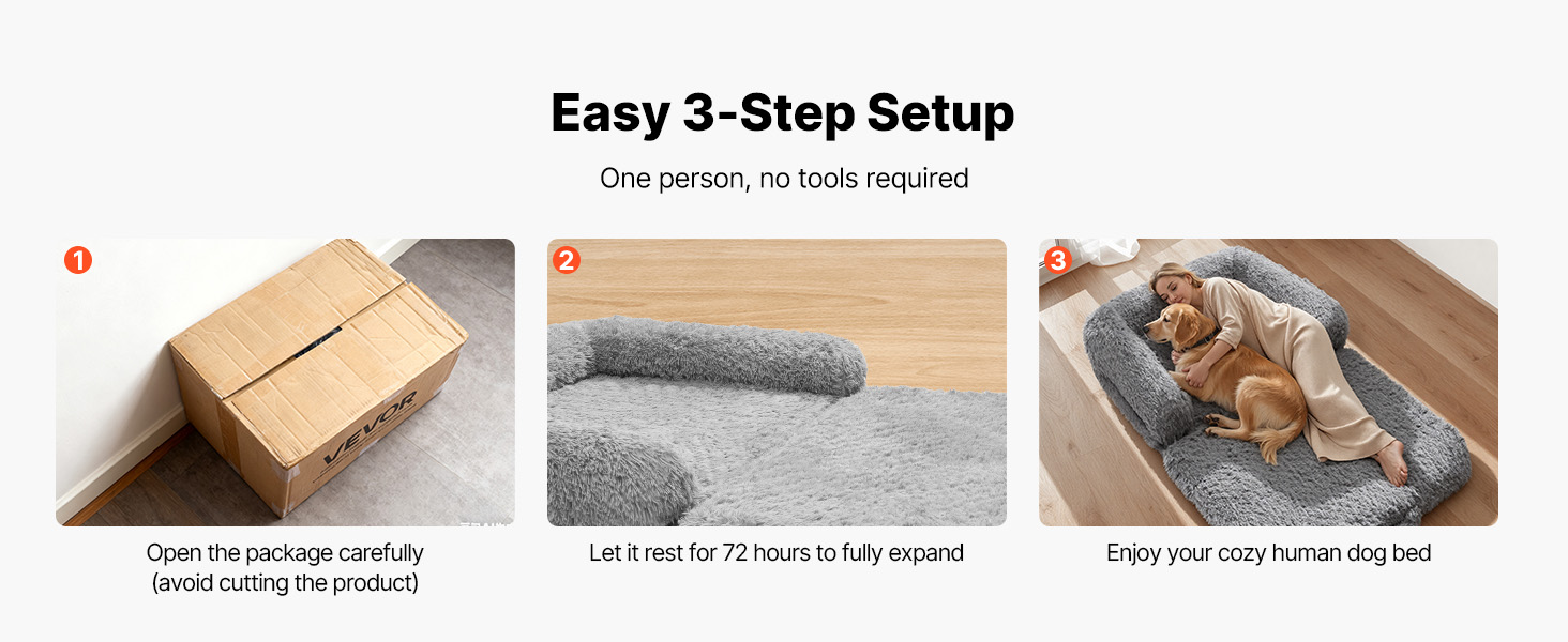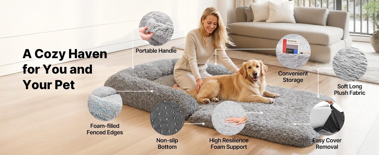 Po dokončení nastavenia ponúka nadrozmerný pelech pre psov pre ľudí útulné zákutie, v ktorom sa môžete spolu so svojím domácim miláčikom schúliť a užívať si jemný odpočinok a teplú spoločnosť. Stane sa malým spoločným útočiskom, ktoré nabáda k blízkosti, pokojnému odpočinku a jednoduchým chvíľam, ktoré si budete vážiť.
