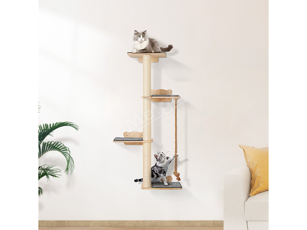 Naša nástenná polica pre mačky obsahuje 4 skákacie dosky, 3 stĺpiky pre mačky a 1 lano pre mačky, ktoré spĺňajú rôzne potreby na lezenie, zábavu, odpočinok a škrabanie, čím obohacujú hru vašej mačky.