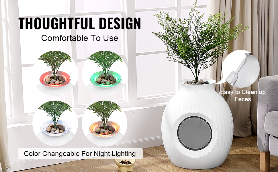 Veľkopriestorový dizajn tejto rastlinnej toalety pre mačky umožňuje vašej mačke natiahnuť sa a užívať si priestranné a pohodlné prostredie toalety. Nemusíte sa obávať, že vaša mačka je príliš veľká na to, aby sa zmestila do rastlinnej toalety pre mačky.