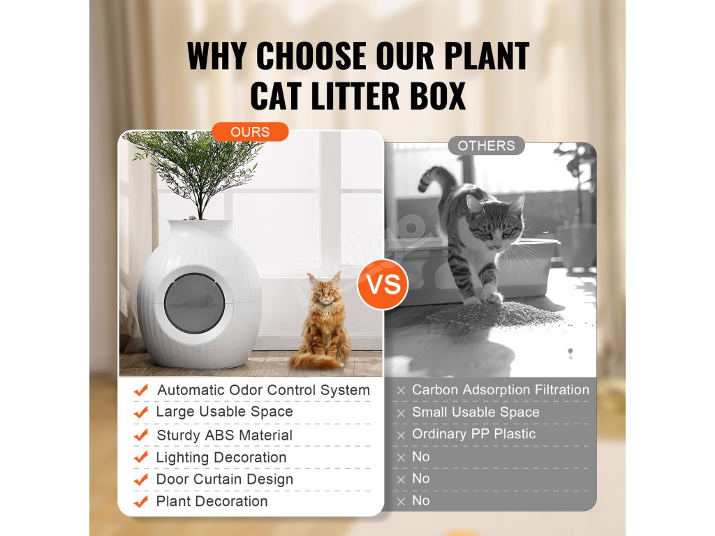 Veľkopriestorový dizajn tejto rastlinnej toalety pre mačky umožňuje vašej mačke natiahnuť sa a užívať si priestranné a pohodlné prostredie toalety. Nemusíte sa obávať, že vaša mačka je príliš veľká na to, aby sa zmestila do rastlinnej toalety pre mačky.