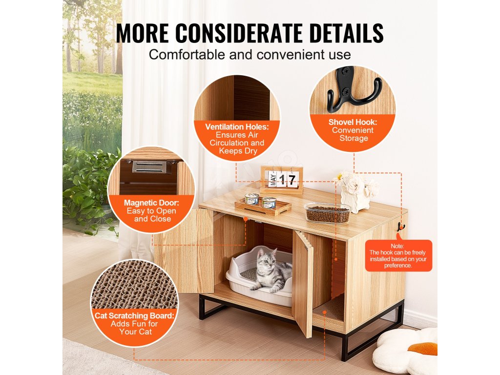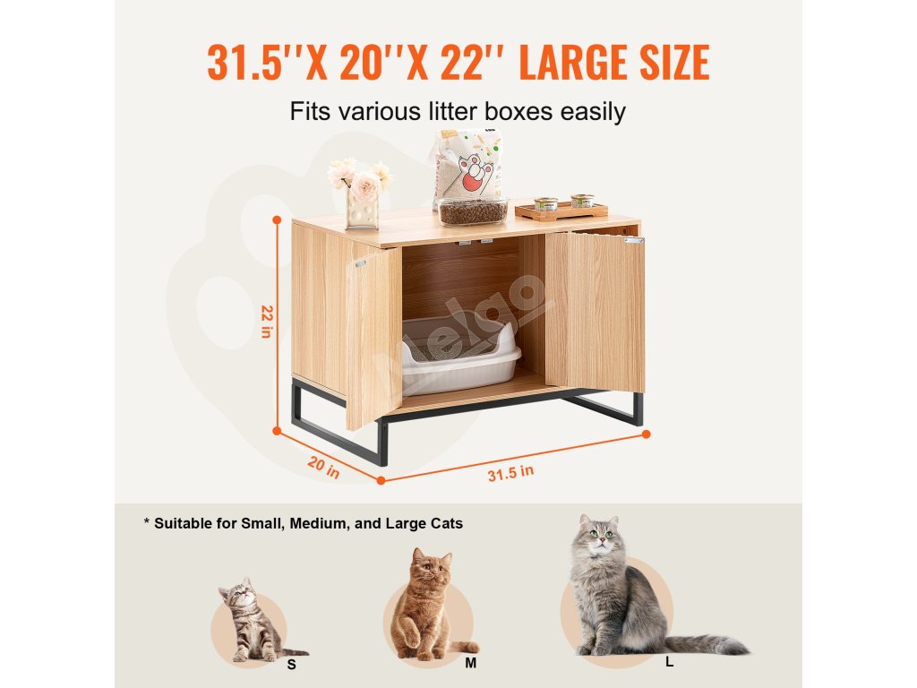 Drevená skrinka na box pre mačky s veľkými rozmermi 31,5" D x 20" Š, ktoré sú vhodné pre malé až veľké mačky, je vybavená vetracím otvorom, ktorý zabezpečuje správne prúdenie vzduchu. Jej súčasťou je aj škrabacia doska, vďaka ktorej sa vaša mačka môže hrať a zároveň si užívať svoj priestor.