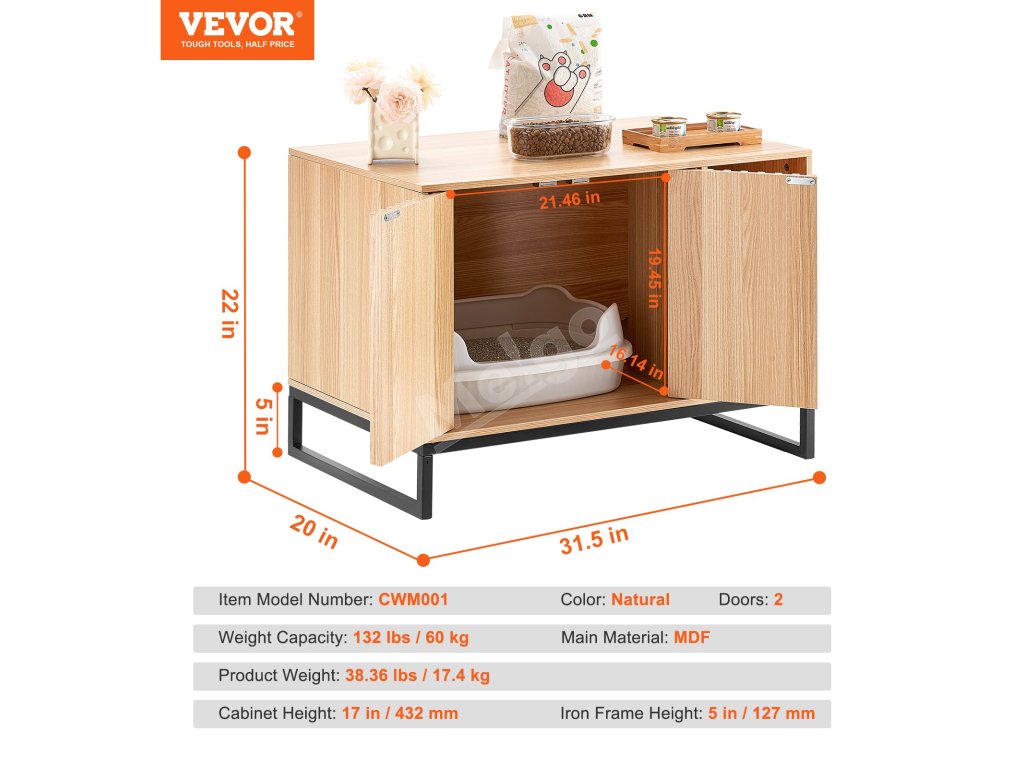 Nábytok do boxu pre mačky s 2 dvierkami, ktorý je vyrobený z MDF dosky s vysokou hustotou a podopierajú ho robustné kovové nohy, zaručuje odolnosť a stabilitu. Jeho robustná konštrukcia umožňuje bezpečne umiestniť naň rôzne predmety, pričom maximálna nosnosť je 132 libier (60 kg).