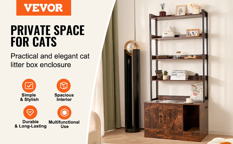 Tento kryt na mačacie záchody so 4 policami dokonale spája štýl a funkčnosť, poskytuje vašej mačke súkromný a pohodlný priestor a zároveň slúži ako praktický kus domáceho nábytku. Jeho elegantný dizajn sa bez problémov začlení do akéhokoľvek interiéru, vďaka čomu bude váš domov uprataný a vaša mačka spokojná.