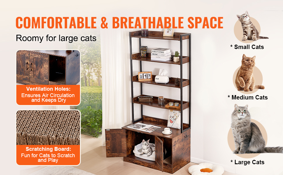 Drevená skrinka na box pre mačky so 4 policami s veľkými rozmermi 33,5 "D x 19,3 "Š je pohodlná a vhodná pre malé až veľké mačky a je vybavená vetracím otvorom, ktorý zabezpečuje správne prúdenie vzduchu. Jej súčasťou je aj škrabacia doska, vďaka ktorej sa vaša mačka môže hrať a zároveň si užívať svoj priestor.