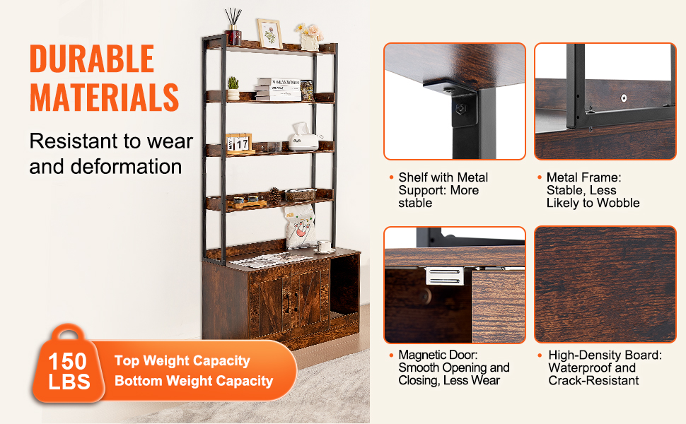 Vďaka doske MDF s vysokou hustotou a robustnému kovovému rámu políc zabezpečuje skrytý nábytok do umyvárne s 2 dvierkami odolnosť a stabilitu. Jeho robustná konštrukcia umožňuje bezpečne umiestniť naň rôzne predmety s maximálnou nosnosťou 150 libier (68 kg).