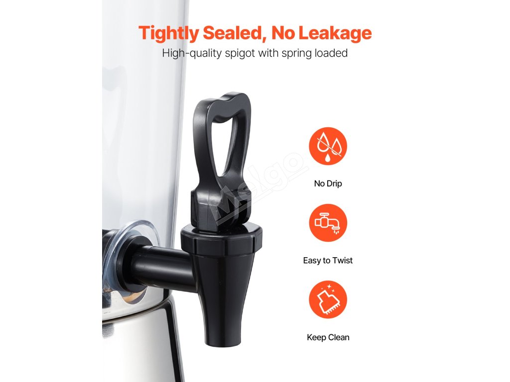 Pružinový výpust je tesne uzavretý, aby sa zabránilo kvapkaniu, vďaka čomu zostane vaša stanica s dávkovačom nápojov vždy čistá. Nízko položený výpustný kohút zaisťuje plynulý prietok na bezproblémové dávkovanie.