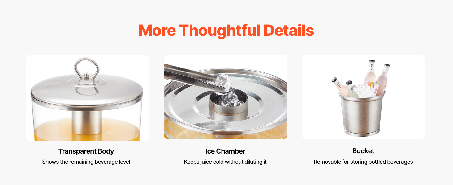 Priehľadný valec prehľadne zobrazuje hladinu nápoja, zatiaľ čo dizajn so širokým hrdlom uľahčuje dopĺňanie. Veko zabraňuje tvorbe prachu a ľadová komora udržiava nápoje studené bez riedenia.