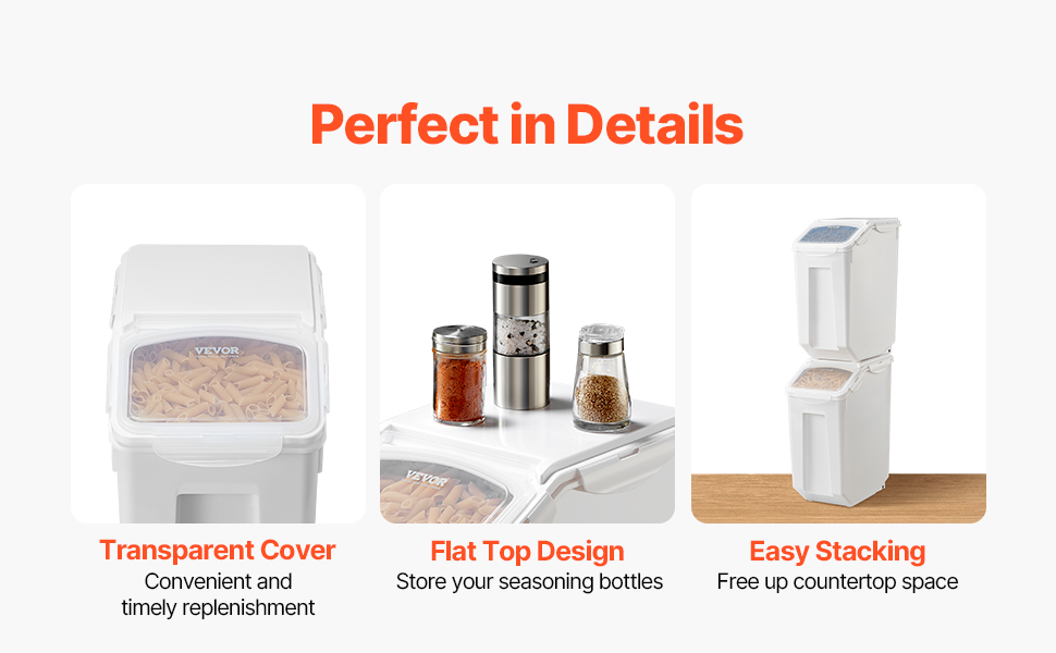 V závislosti od typu a hmotnosti vášho suchého tovaru sa do nádoby na uskladnenie ryže zmestí až 35 kilogramov ryže alebo 17 kilogramov krmiva pre domáce zvieratá. Jeho stohovateľná konštrukcia vám umožní efektívne usporiadať špajzu alebo skladovací priestor využitím vertikálneho priestoru.