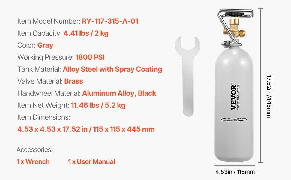Naša prémiová nádrž na CO2 z legovanej ocele s hmotnosťou 11,46 lbs zaručuje dlhotrvajúci výkon. Svetlošedý nástrek poskytuje štýlový vzhľad a chráni fľašu pred poškodením a každodenným opotrebovaním, čím udržiava vašu fľašu v dobrom stave.
