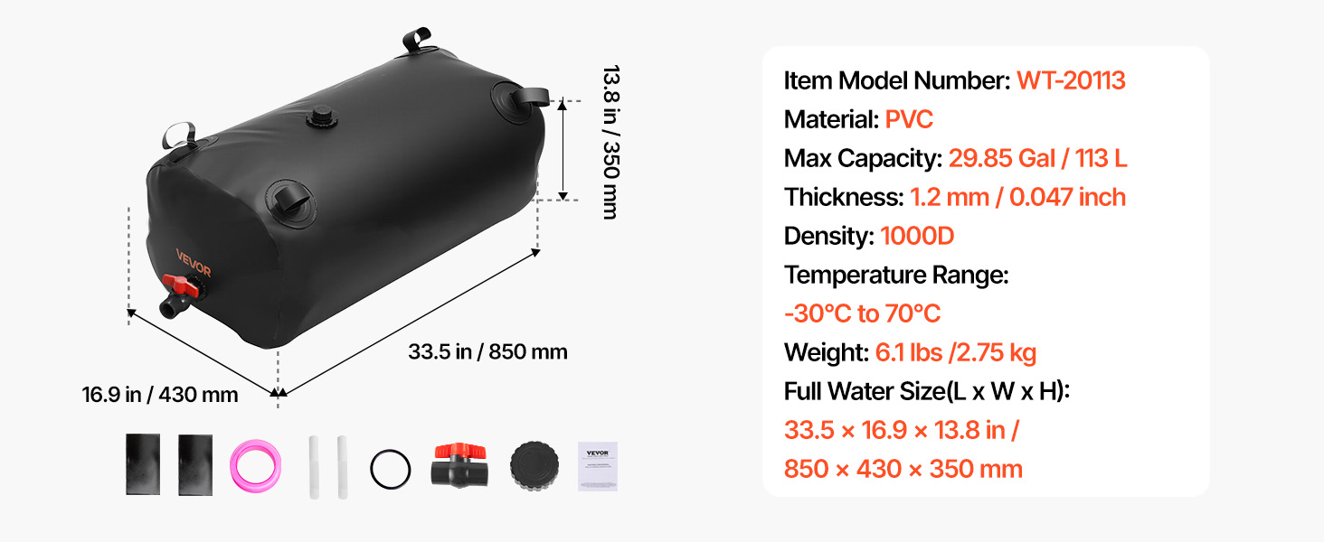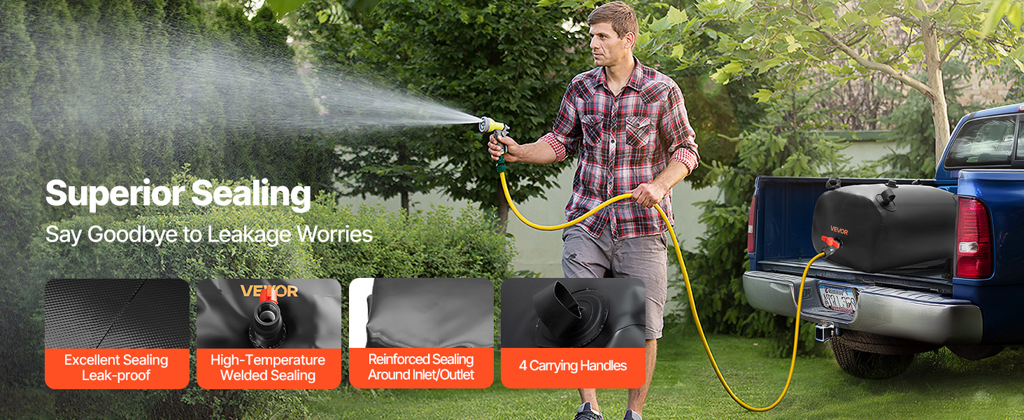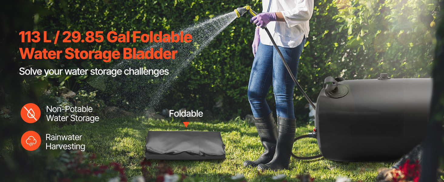 Tento skladací vak na vodu VEVOR s objemom 29,85 galónov/113 litrov je vyrobený z odolného dvojvrstvového PVC materiálu 1000D, ktorý poskytuje vynikajúcu odolnosť. Jeho silné tesnenie a nepriepustná konštrukcia zaisťujú spoľahlivé uskladnenie vody na vonkajšie dobrodružstvá, domáce použitie, záhradkárčenie alebo v núdzových situáciách