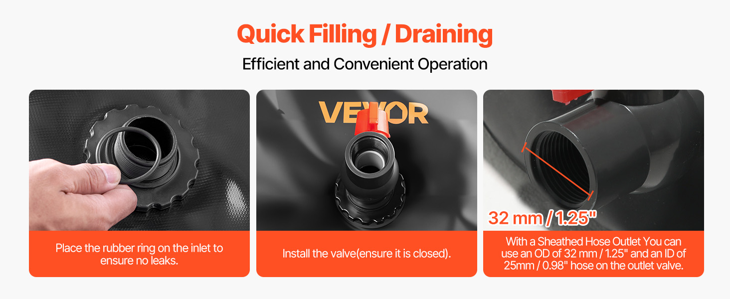 Naša skladacia nádoba na vodu je vybavená vstupmi a výstupmi s veľkým priemerom, ktoré zabezpečujú plynulý prietok vody a ľahkú kompatibilitu s rôznymi hadicami a vysokotlakovými čističmi. Ideálna na domáce použitie, kempovanie a iné vonkajšie aktivity.