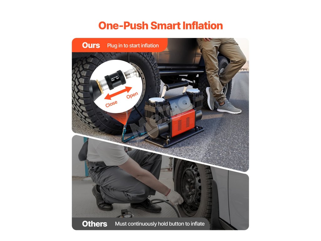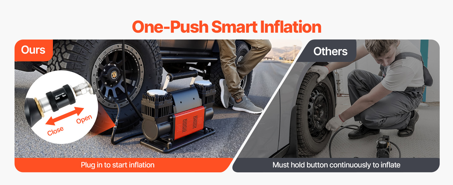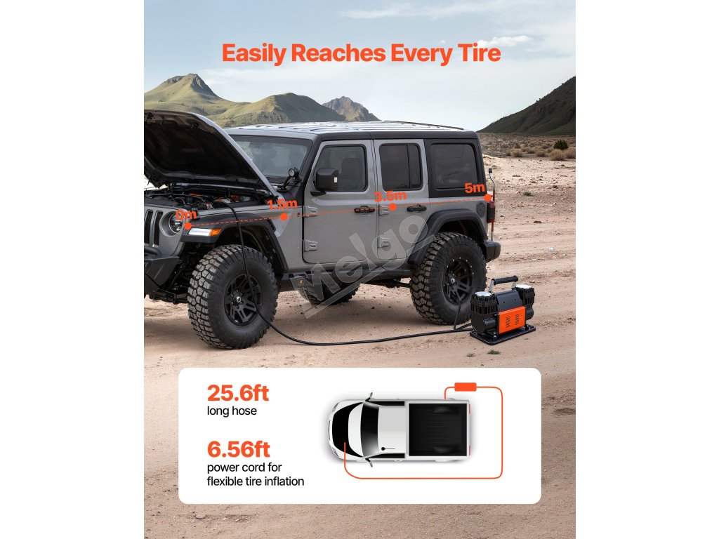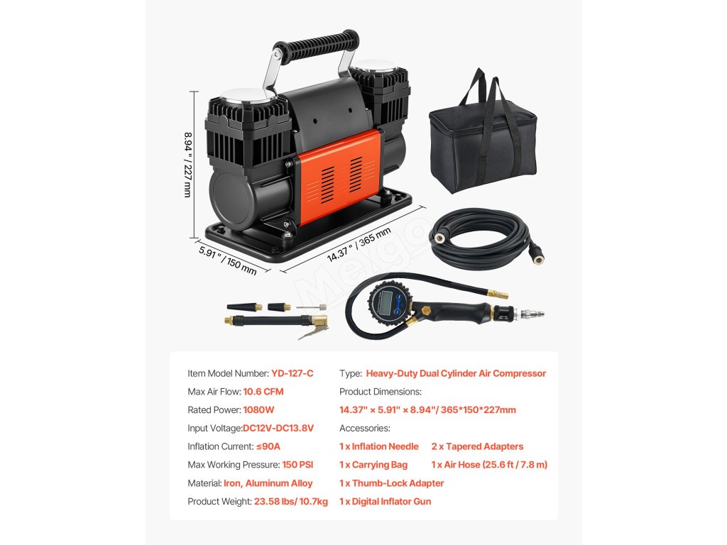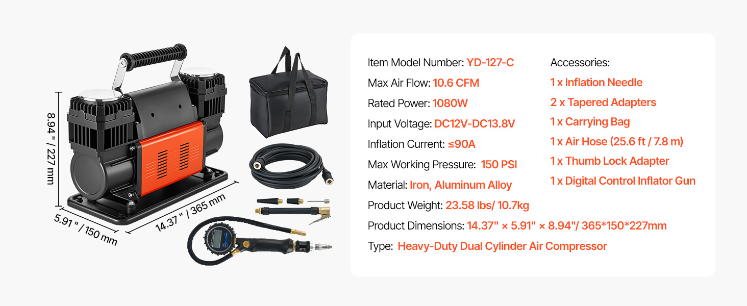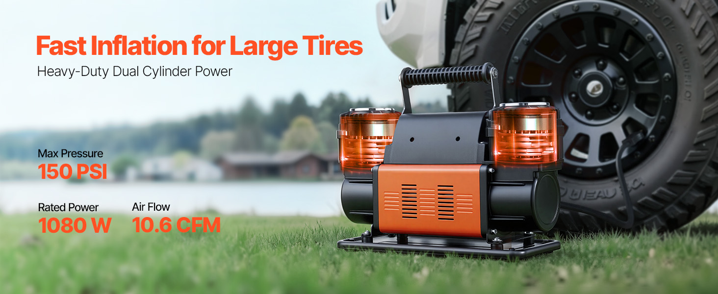 Táto prenosná hustilka pneumatík poháňaná vysokoúčinným motorom s výkonom 1080 W poskytuje maximálny pracovný tlak až 150 PSI a vysoký prietok vzduchu 300 L/min. Účinne nafukuje pneumatiky osobných automobilov, SUV, nákladných vozidiel, motocyklov a bicyklov, ako aj športové lopty a rekreačné zariadenia.