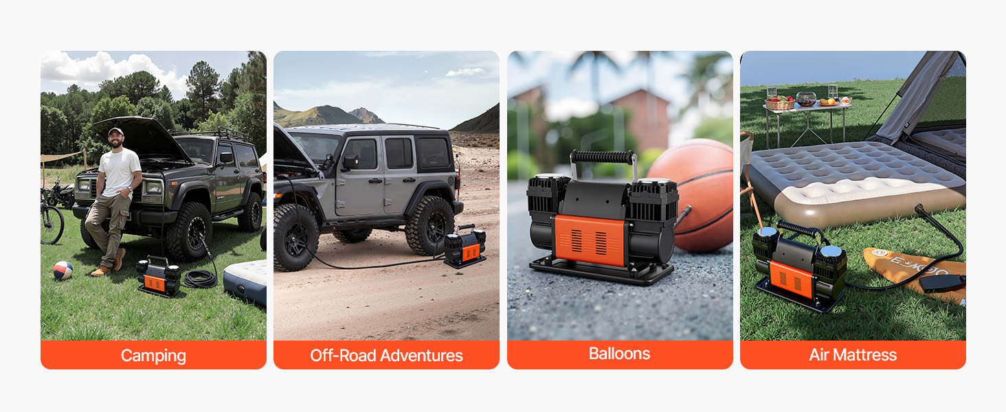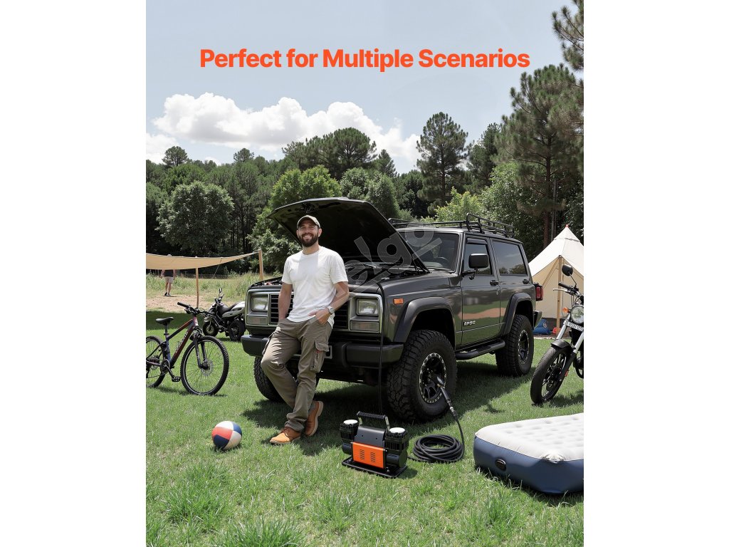 Tento prenosný vzduchový kompresor, vybavený nafukovacími adaptérmi, je všestranne použiteľný pre osobné vozidlá, SUV, nákladné vozidlá a obytné automobily, pričom je vhodný aj pre motocykle, bicykle, športové lopty, nafukovacie hračky, nafukovacie matrace a ďalšie.