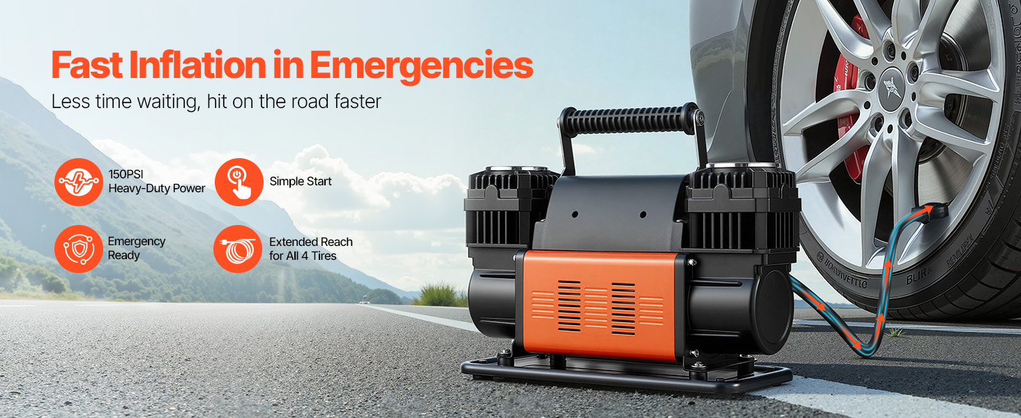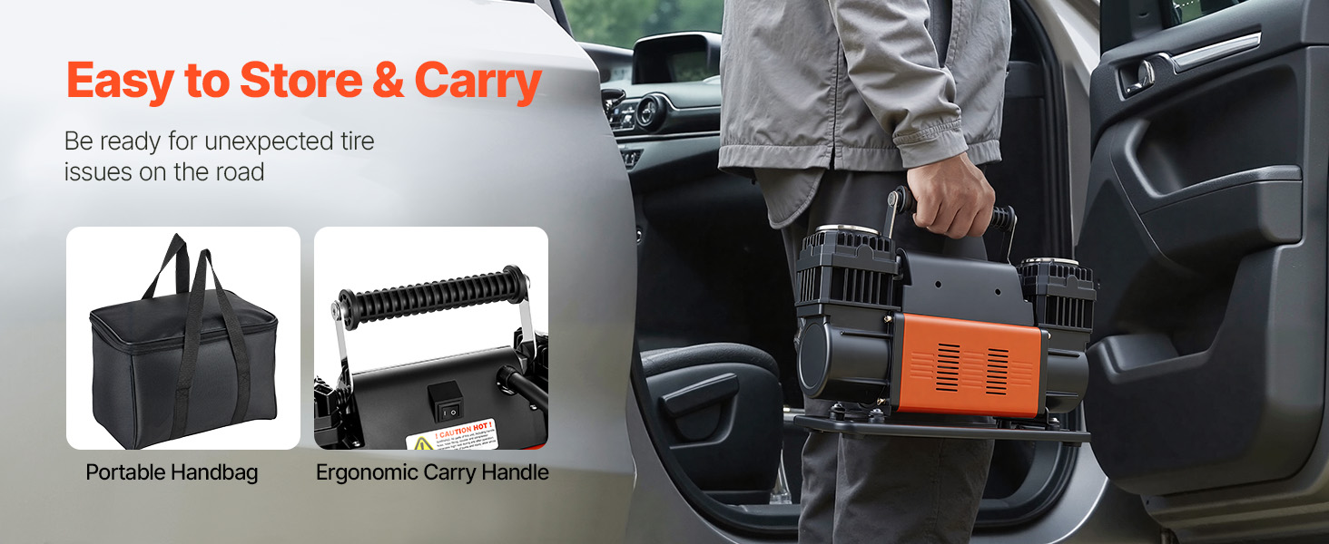 Vzduchový kompresor VEVOR 12 V pre veľké zaťaženie je spoľahlivým spoločníkom na cestách. Vďaka modernizovanej dvojvalcovej konštrukcii, vysokému prietoku vzduchu 300 l/min a maximálnemu pracovnému tlaku 150 PSI účinne nafukuje pneumatiky vozidla a pomáha vám rýchlo sa vrátiť na cestu.