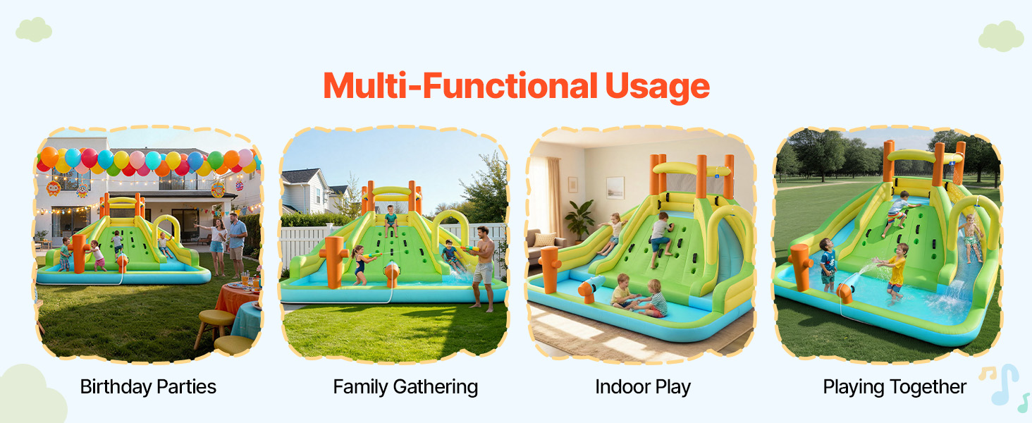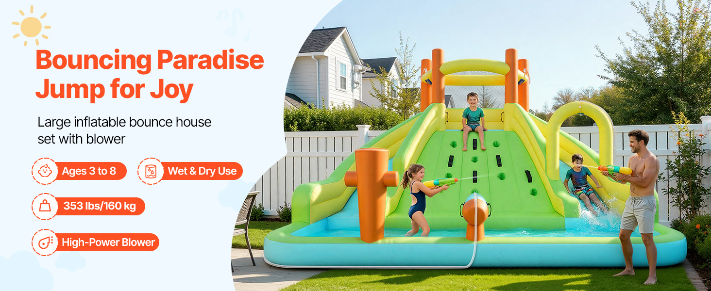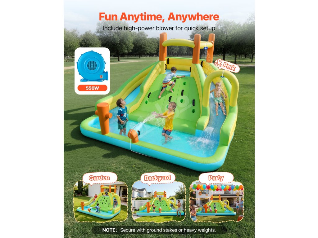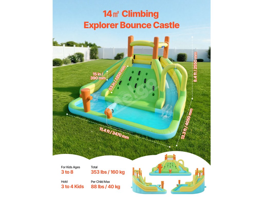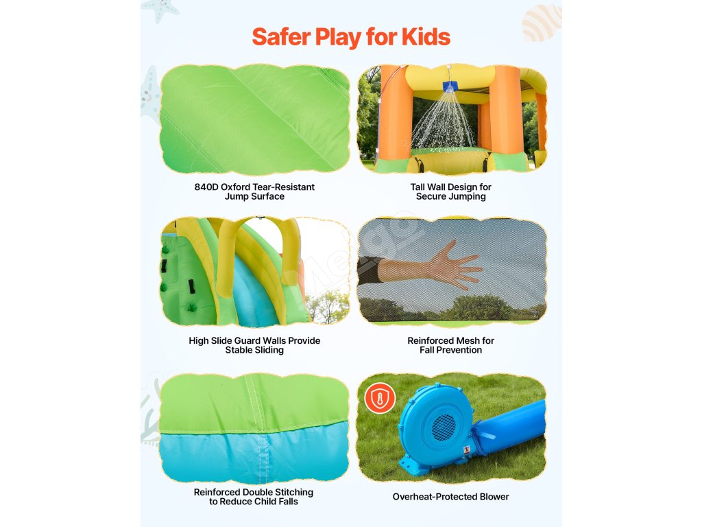 Tento detský nafukovací vodný park VEVOR kombinuje podšívku 190T s odolnou odrazovou zónou 840D, aby podporil pevný celkový tvar. Kľúčové namáhané oblasti využívajú technológiu dvojitého šitia na zlepšenie pevnosti švov, čo pomáha znížiť otvory a riziko pádu detí z bokov pri skákaní.